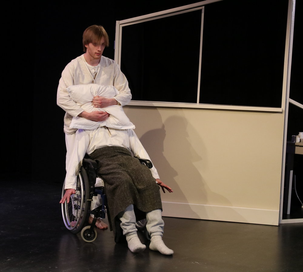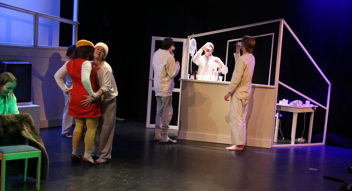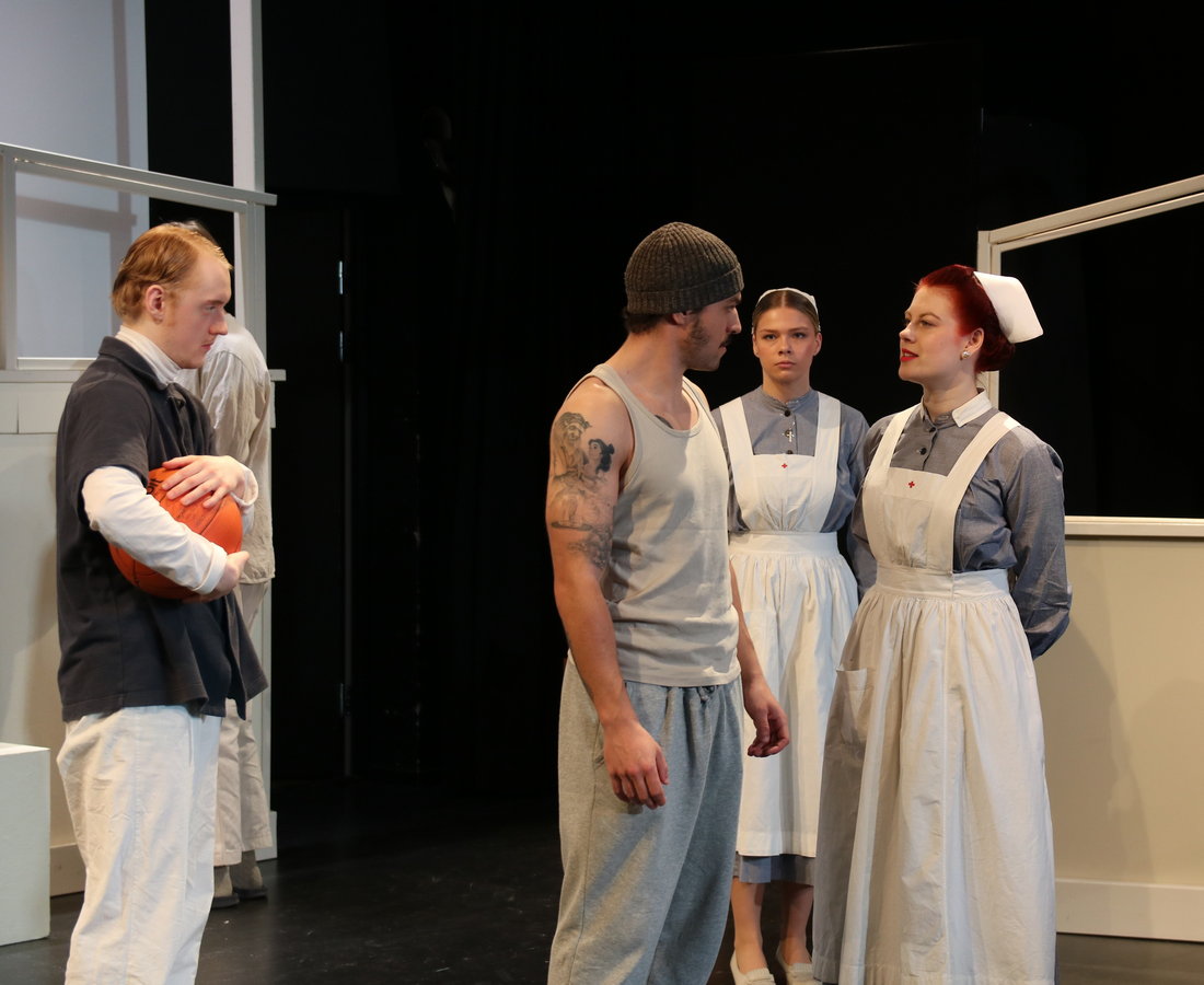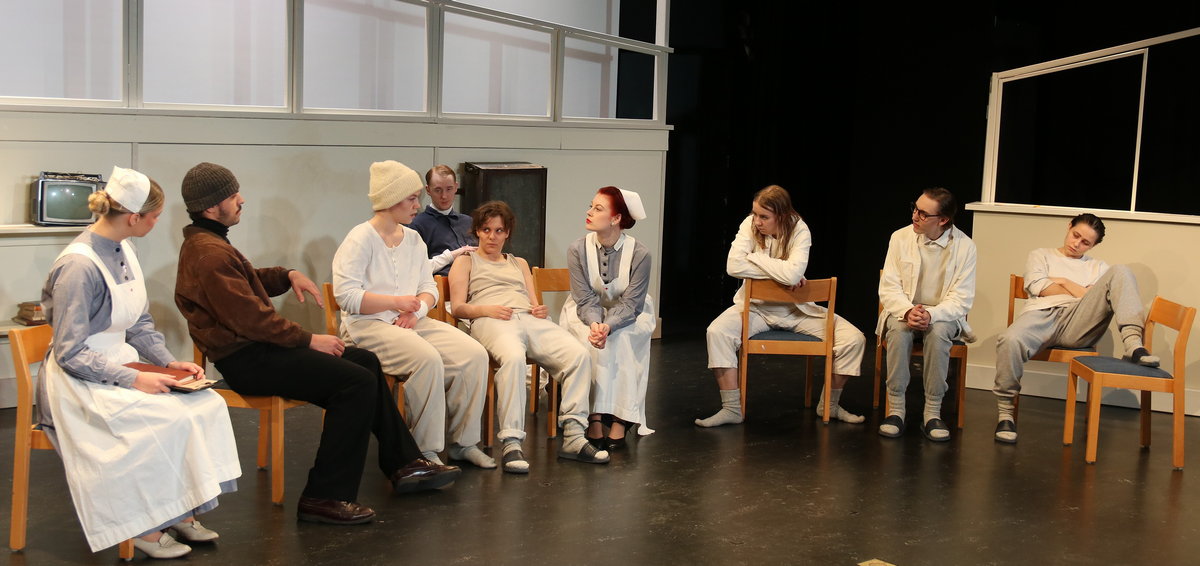 Scenen är enkel. Allt sker i ett kalt rum där instängdheten är påtaglig. Det handlar om en institution där mentalpatienter med olika diagnoser som vistas inlåsta.