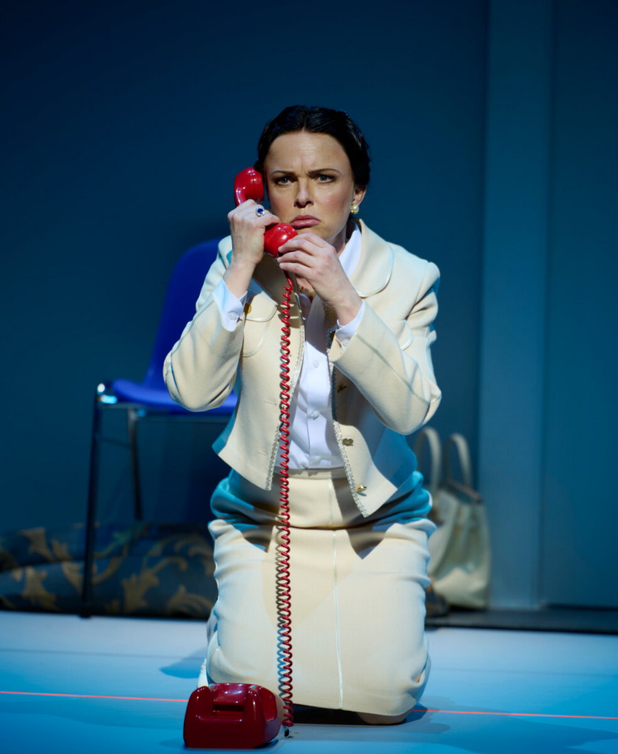 Inledningen till Teaterdirektören är elegant och effektfull på ett sätt som skapar förväntningar. En ensam röd telefonapparat står framför ridån under tiden ouvertyren spelas. Ridån går upp, telefonen ringer och vi befinner oss i ett repetitionsrum. Det börjar alltså bakom kulisserna tiden före en planerad föreställning. Opera om en del av operans vardag alltså.