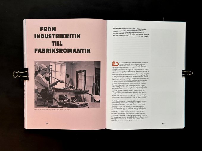 För att ge tyngd åt firandet har de bjudit in några skribenter som ska ge mera övergripande kontext. Museimannen m.m. Love Jönsson, ett obligatorium i snart sagt alla konsthantverkssammanhang, skriver under rubriken Från Industrikritik till fabriksromantik. Han väljer att fokusera på förhållandet mellan hantverk och industri. Han har många svepande generaliserande påståenden av typ ”… i början av 00-talet kunde postindustriell keramik identifieras som en särskild genre.” ? Han menar att ”…det postindustriella tillståndet skapar en ny relation mellan fabrikerna och konsthantverkarna.” Den här välskrivna texten kan inte sägas ge förklarande eller fördjupande perspektiv på det skapande som presenteras av Blås & Knådas medlemmar.