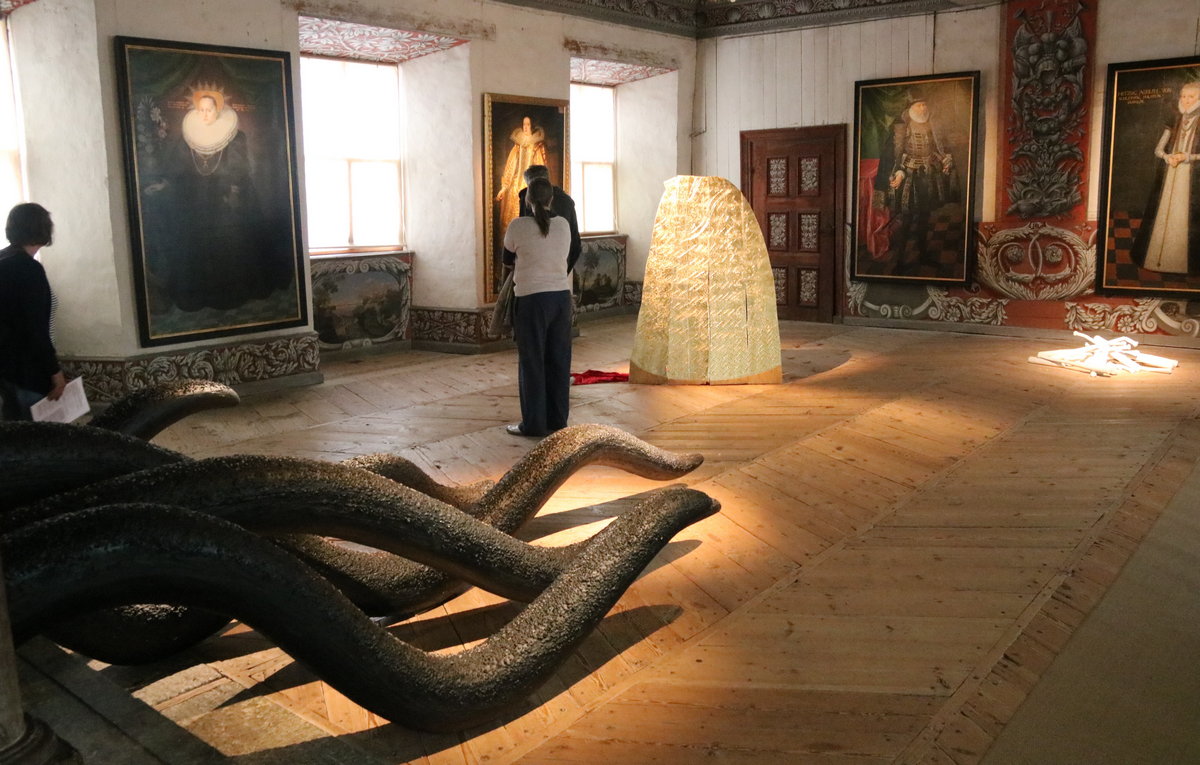 Hela Läckö slott är ju ett värn med tjocka skyddande murar. Men hur väl kan man skydda sig. In genom en öppen spis kommer nu vad jag uppfattar som enorma bläckfickarmar. Det hot och den rädsla de fyller rummet med är vi värnlösa emot. Obehaget tränger sig in i det som skulle vara skyddat och tryggt. Värnlösheten är tankeväckande.