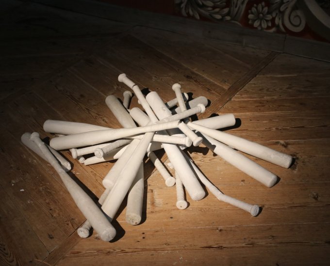 Här finns också former som liknar klädnader som hänger ner. På golvet står en som tydligast anknyter till värntemat. Den är murad med tegelstenar. En annan hänger från taket. Den är gjort i asfalt, ett livlöst material med dödens matta mönster. Den tredje är mer svårtolkad. En klädnad har ”levande” potatisar monterade. Potatisen är en obetydlig vardagsvara. Men i vissa kulturer symboliserar den jordens fruktsamhet och kvinnlig energi, men också trygghet i vardagen.