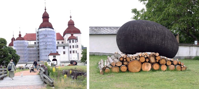 På väg upp till Läckö slotts ingång ser jag en timmerstapel till höger. Och på den ligger en stor amöbaliknande svart form. Det pågår byggnadsarbeten på slottet, har det med det att göra?