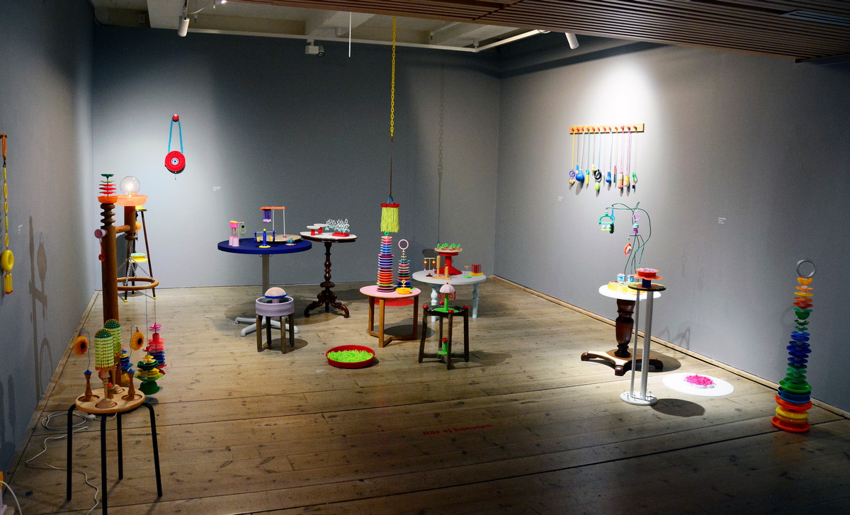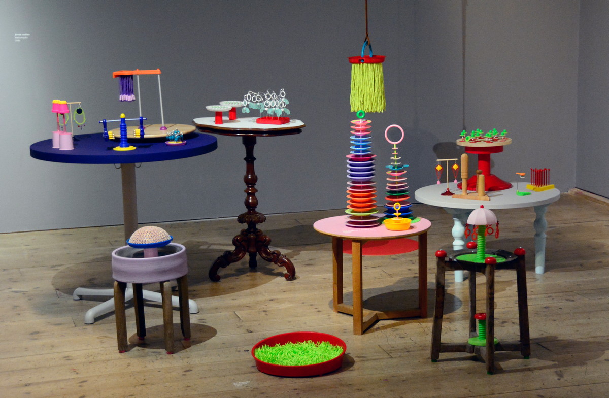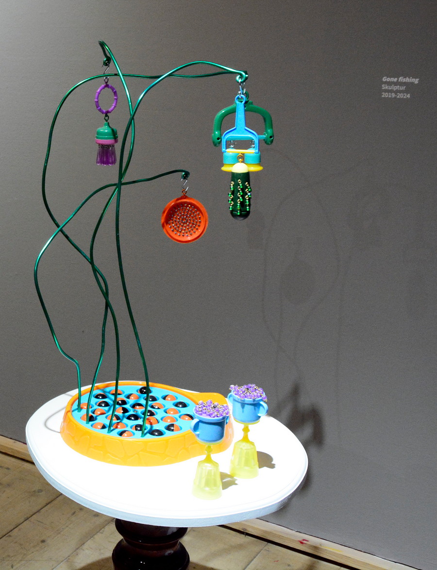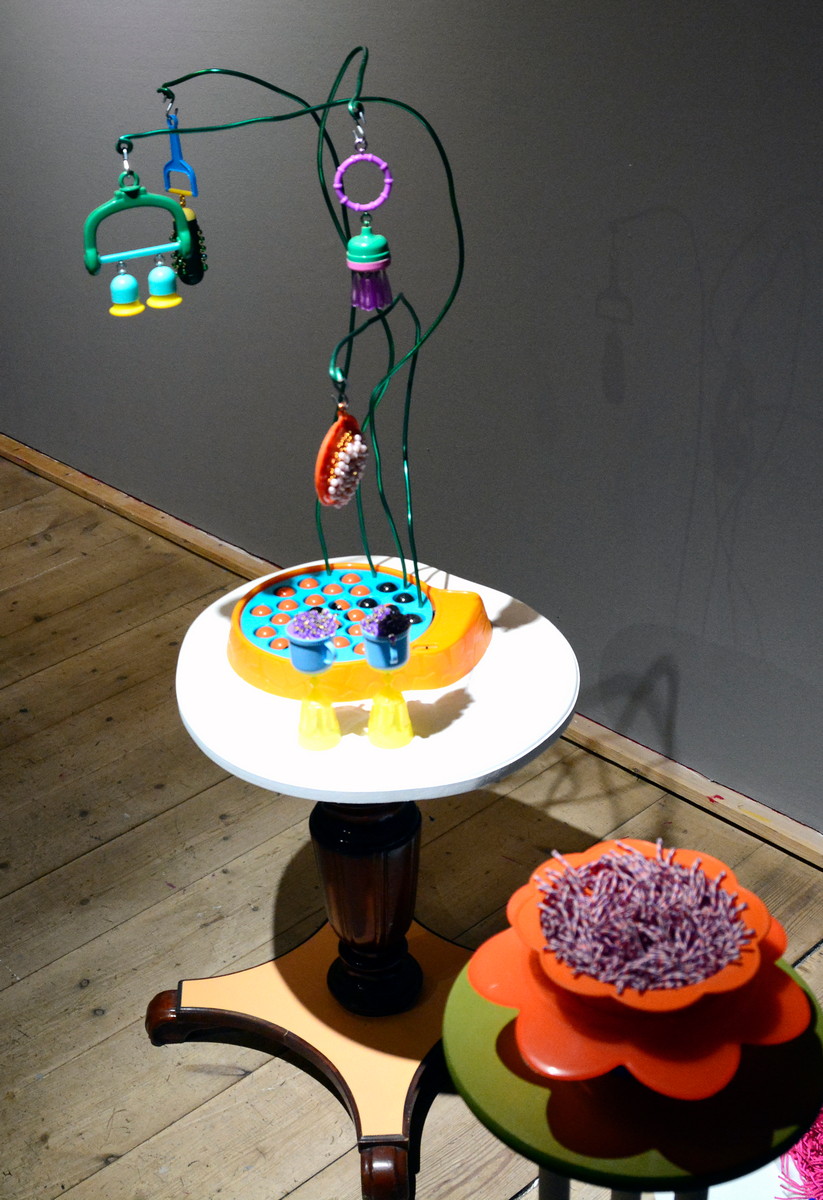 När en kikar in i Lilla Galleriet möts man av ett myller av former och en lågmäld kakafoni av färgade plastleksaksföremålskonstruktioner. Det handlar om återbruk med funktionsbyte.