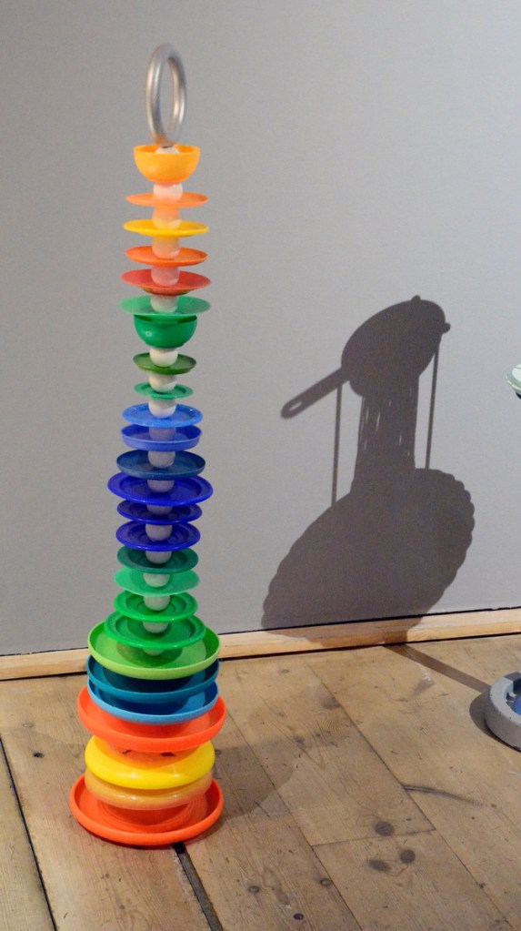 En som får göra det är uppbyggd som en trave av olikfärgade plast assietter. Det blir en kul pelare, en konstfullt monterad tallrikstrave. Men montaget får inget skulpturalt mervärde.