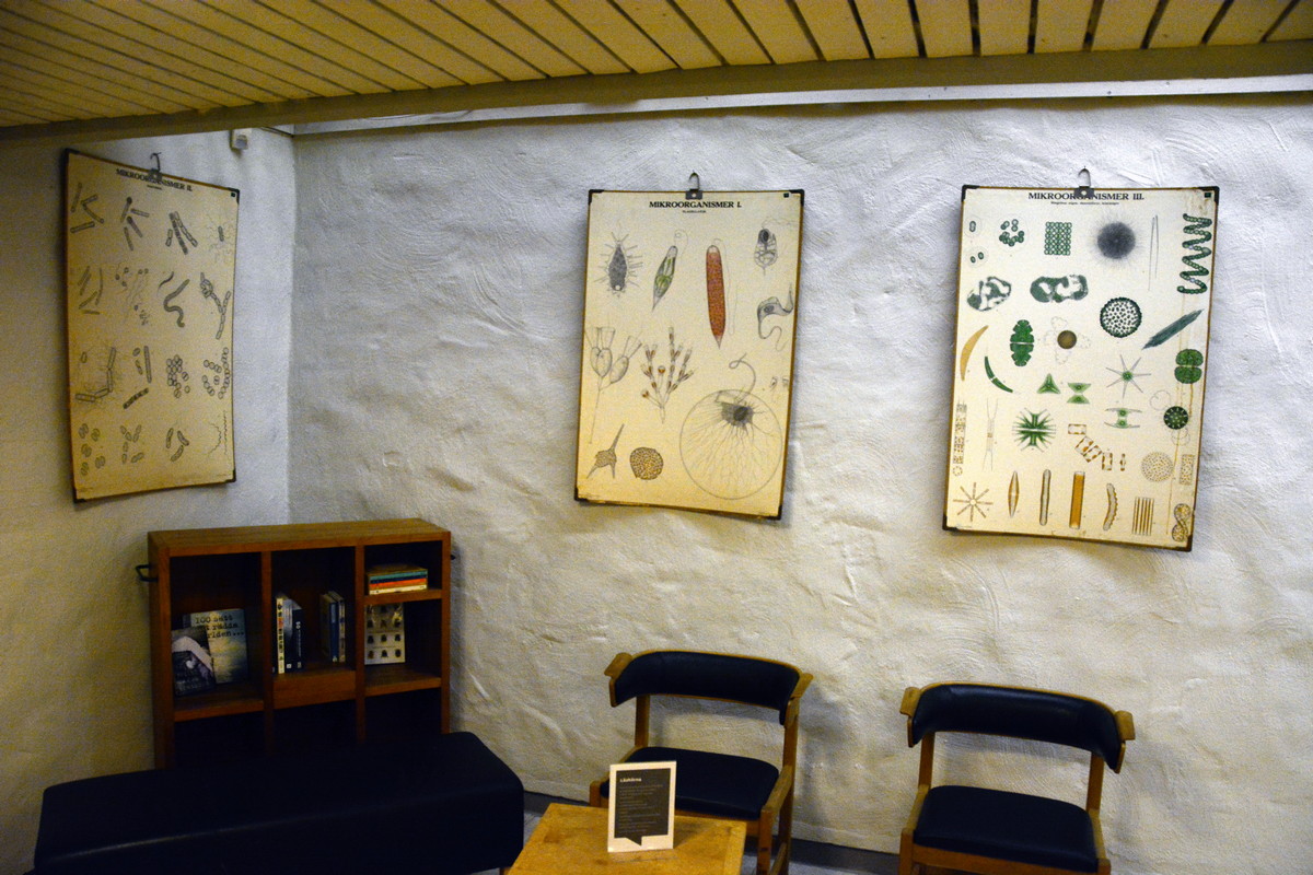 Tydligare var en vägg med historiska skolplanscher med mikroorganismer som motiv. En annan tids presentationsteknik. Oklart om utställaren också menar att det är ett tidsbundet synsätt. Det finns också böcker i utställningen. Lästips antar jag.