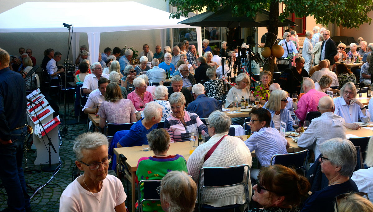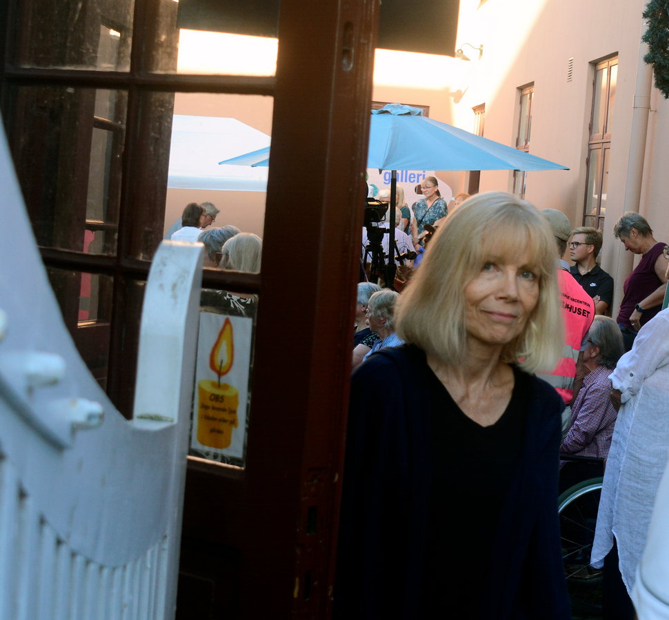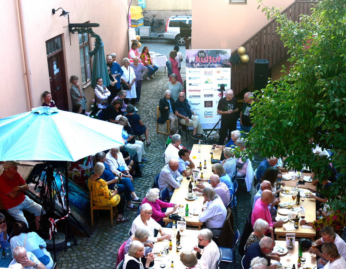 På onsdagen var det avslut för årets KAC:s ”Kultur på innergården” hos Rosa huset i Skövde. Redan vid sextiden på kvällen, en timma före scenframträdandet, var de flesta sittplatserna upptagna av de som hade beställt mat och andra som bara drack en öl och/eller talade med varandra. God stämning och gott väder en riktigt fin sommarkväll.