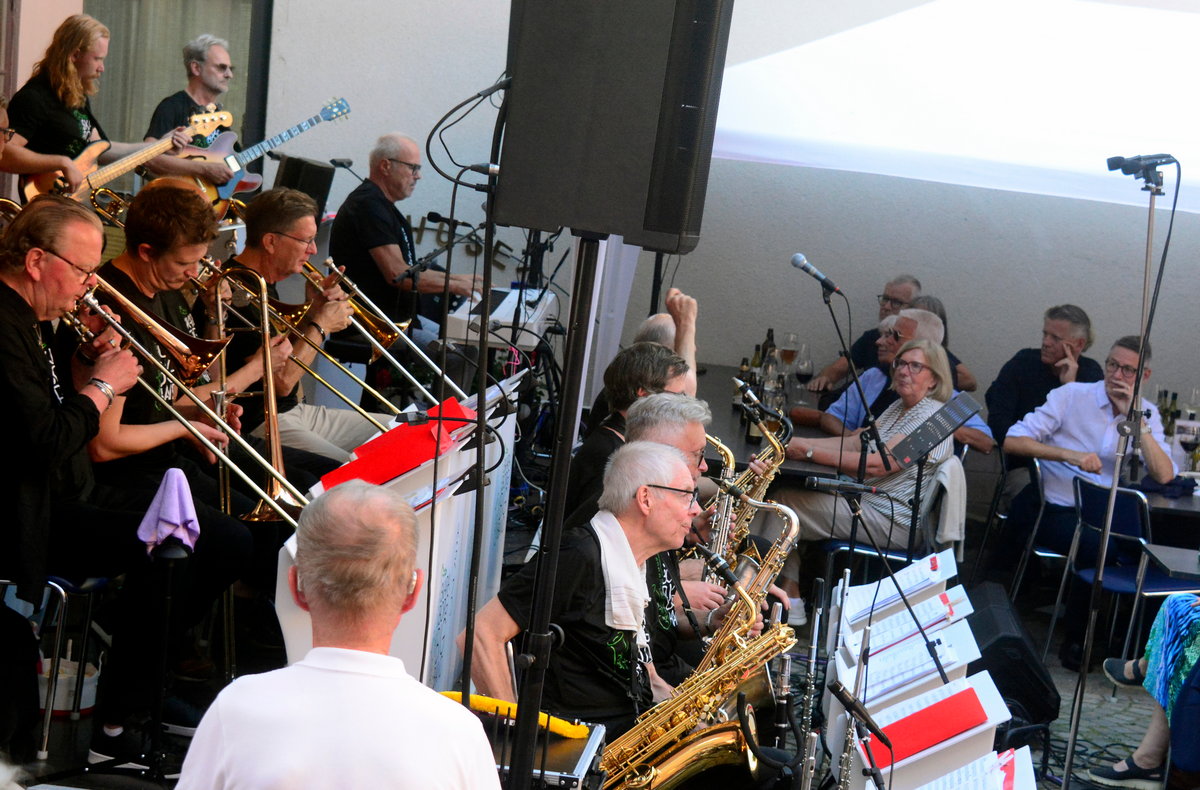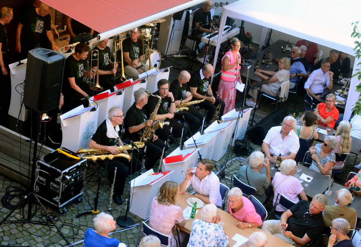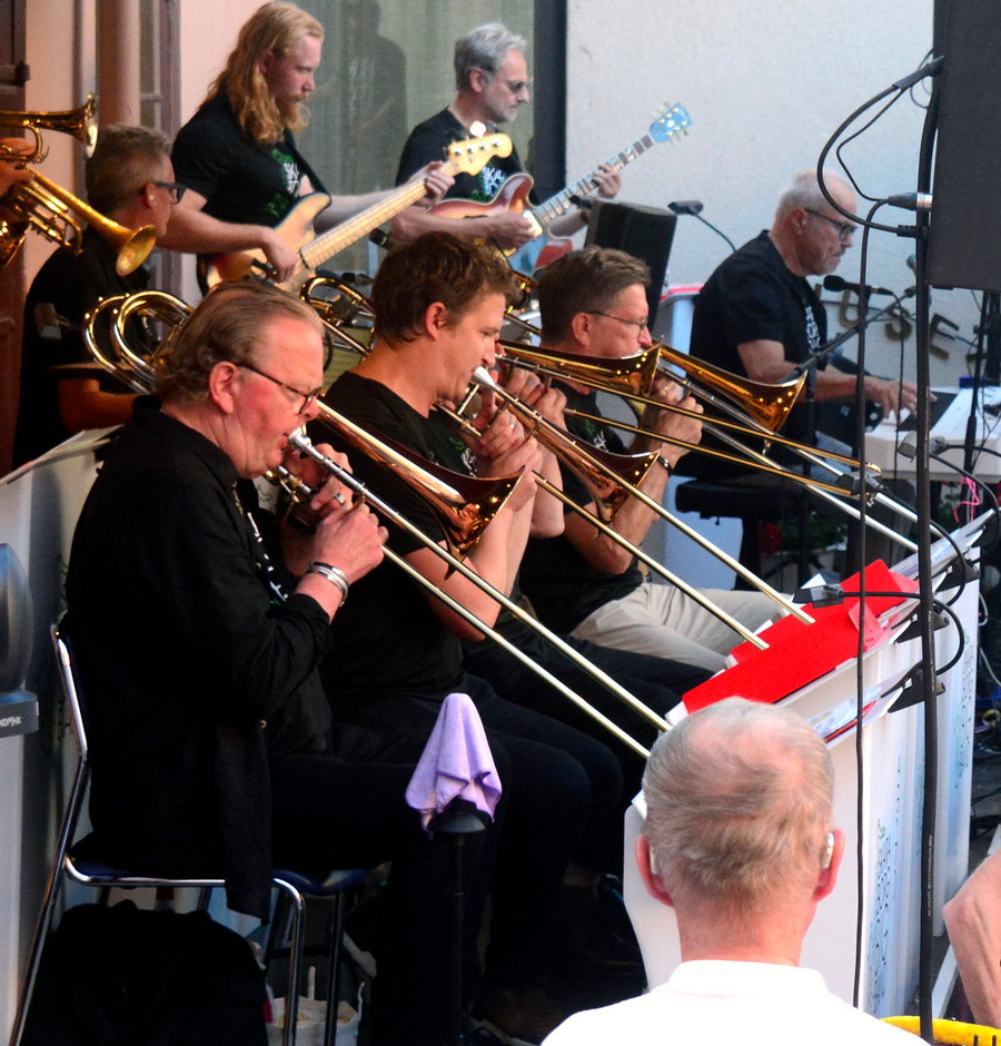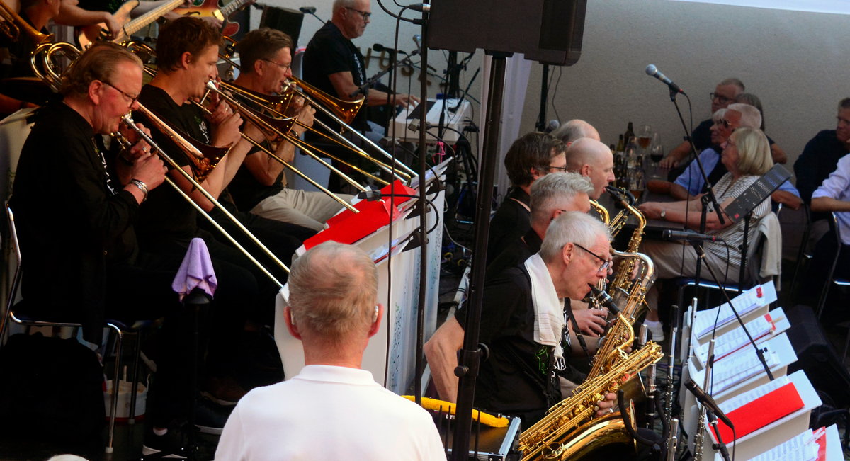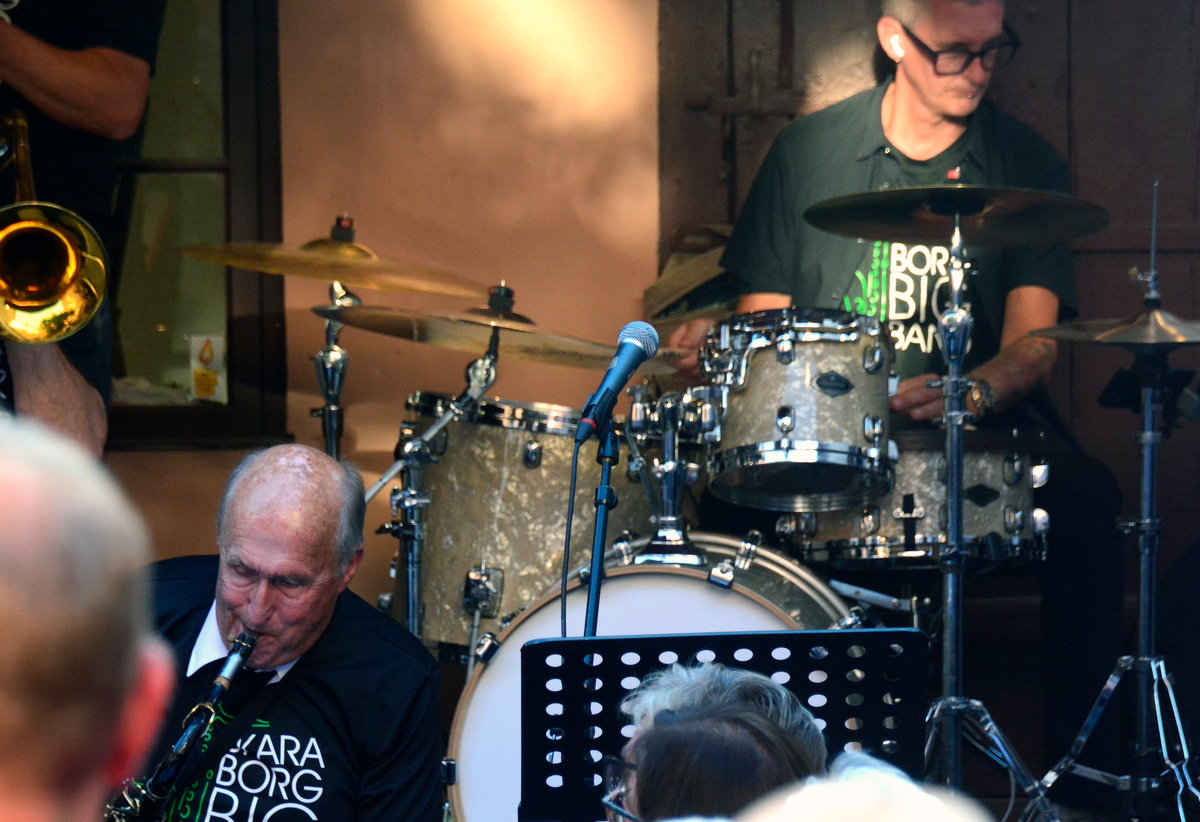 Vid sju intog SkaraBorg Big Band scenen. Ja, inte bara den utan även en meter framför den för att alla skulle få plats.