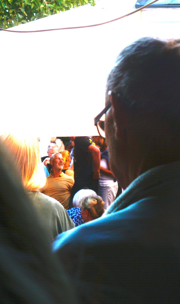 Jag hade tänkt genom det och i tanken tänkt att det från huset borde finnas någon plats där man kunde fota en större del av scenen. Och jag försökte det, men överallt fanns det en markis, ett parasoll eller ett partytält som var ivägen.