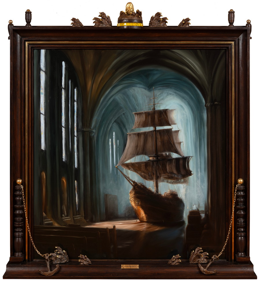 Målningarna liknar i detaljerna vissa förlagor, men till sin helhet och verkan är de både säregna och egensinniga. Här finns många surrealistiska grepp som lek med proportioner. I en har en kyrka placerats på ett segelfartyg och en annan ryms det stora skeppet i en kyrkas mittskepp. Sånt känns liksom självklart i den billgrenska bildvärlden.