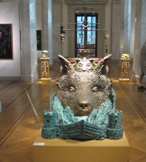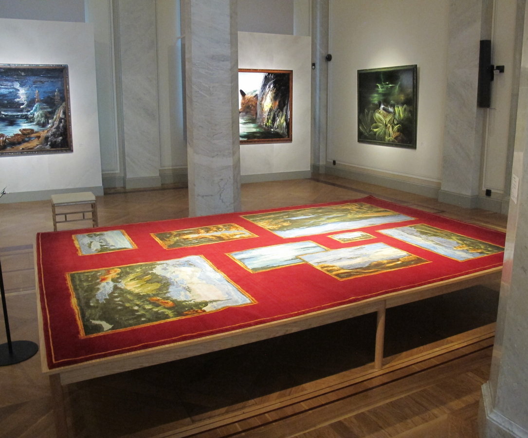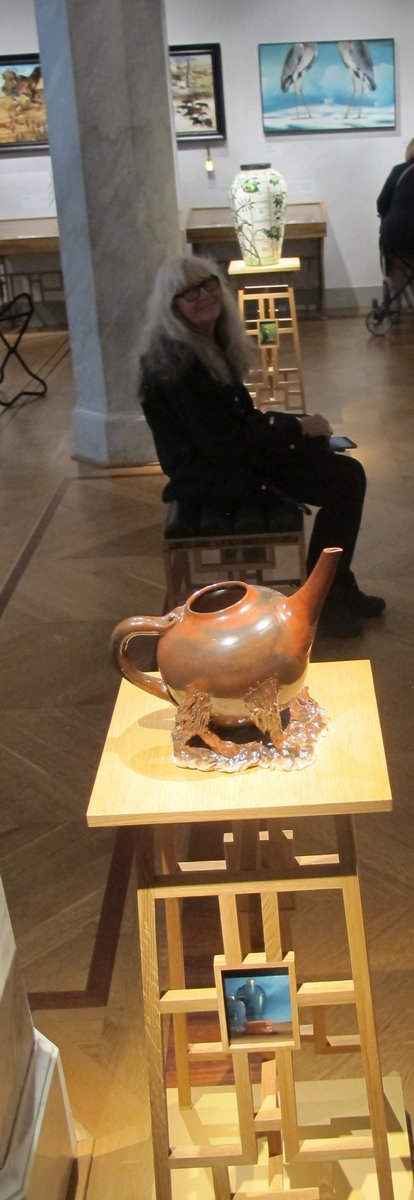 Här finns också skulpturer. En tekanna med fötter är inte min kopp te. På ett stort bord ligger en jättestor matta med konstplanscher i ett fult mönster.