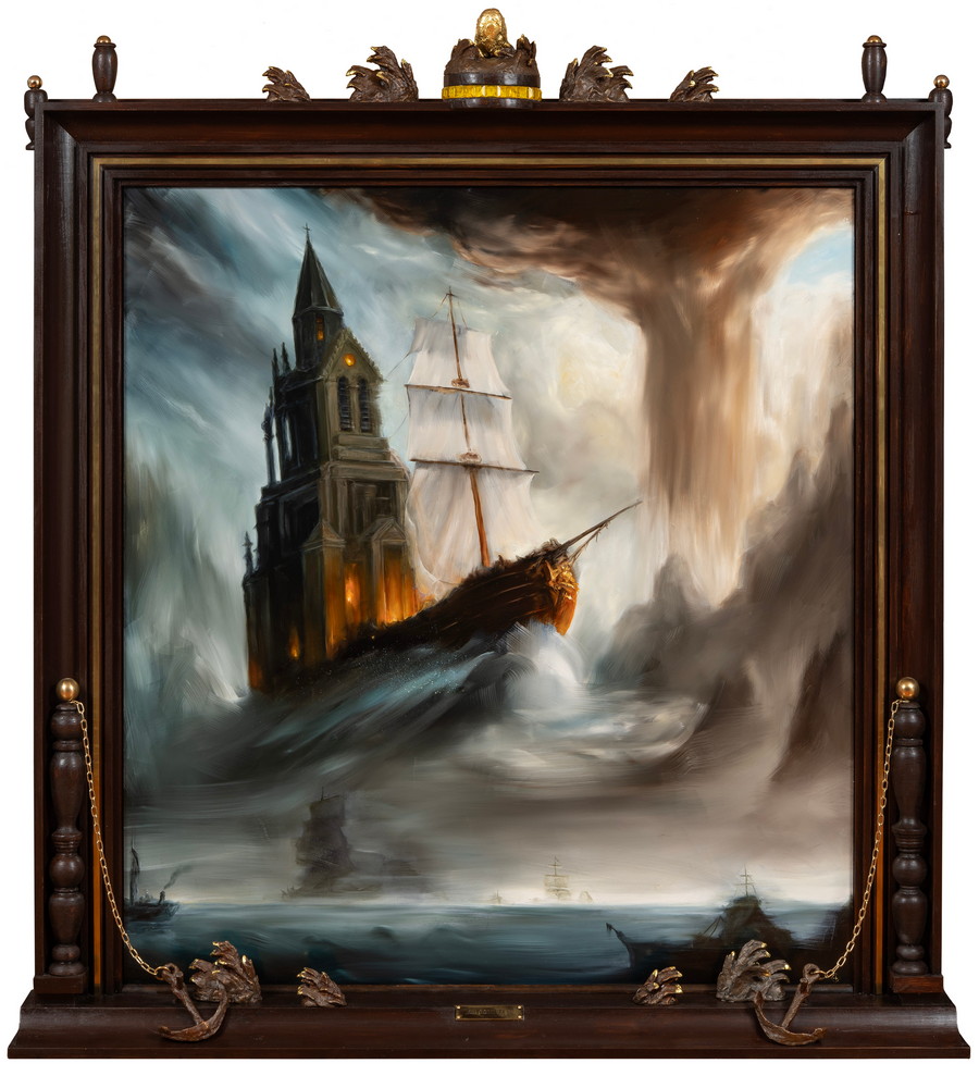 Målningarna liknar i detaljerna vissa förlagor, men till sin helhet och verkan är de både säregna och egensinniga. Här finns många surrealistiska grepp som lek med proportioner. I en har en kyrka placerats på ett segelfartyg och en annan ryms det stora skeppet i en kyrkas mittskepp. Sånt känns liksom självklart i den billgrenska bildvärlden.
