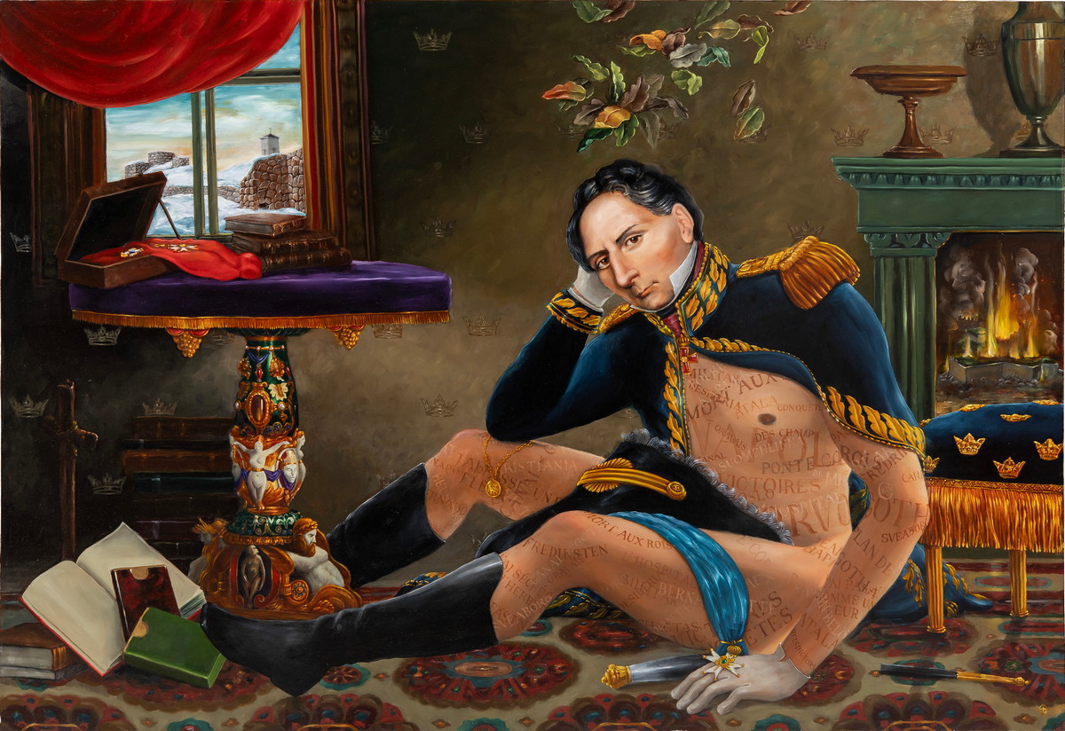 En favorit är målningen Från Sveaborg till Fredriksten. Karl XIV Johan sitter i en pose lånad från en målning av Louis Èdouard Rioult. Han visar hud med tatueringar med antirojalistsikt tema. Bilden är fylld av detaljer från ett officiellt porträtt av kungen med vissa betydelsebärande uppdateringar.