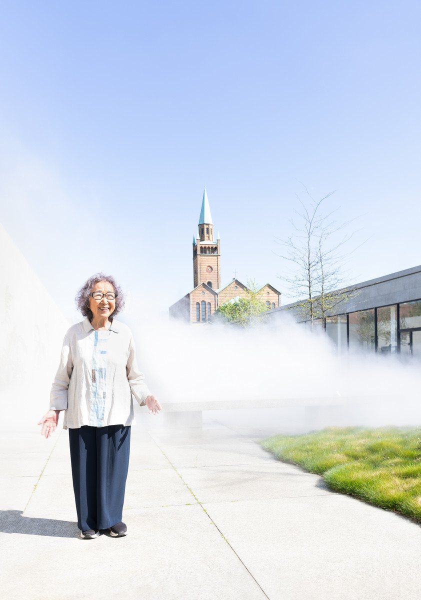 Fujiko Nakaya in her fog sculpture in the sculpture garden of Neue Nationalgalerie, 2025 och Fog sculpture by Fujiko Nakaya in the sculpture garden of Neue Nationalgalerie, 2025, © Neue Nationalgalerie – Stiftung Preußischer Kulturbesitz / David von Becker