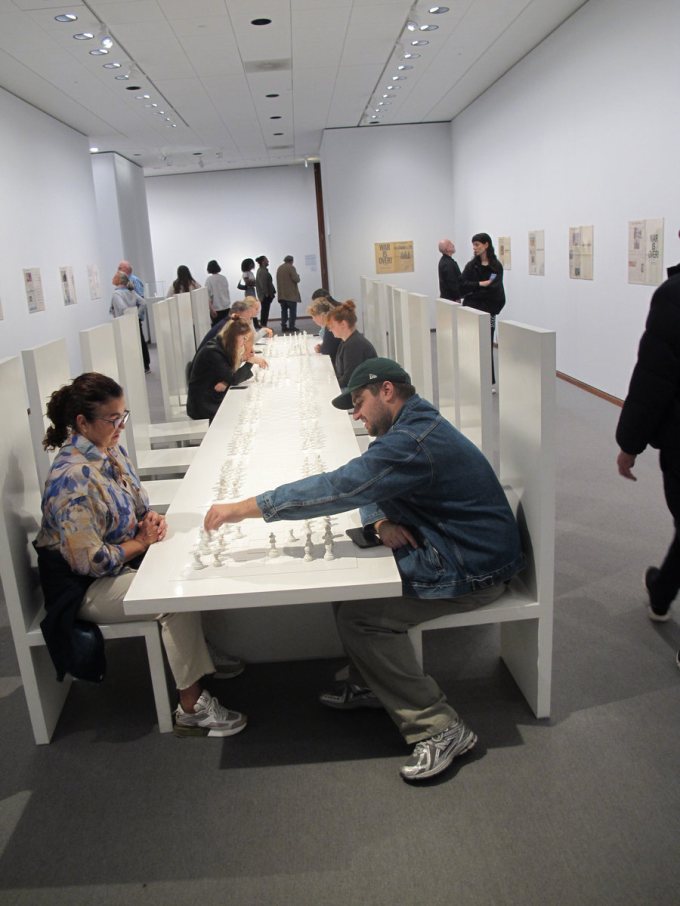 Vid ett annat bord satt rader av spelare för att spela ett schackparti med bara vita pjäser. Instruktionen är att ”spela så länge du fortfarande vet var dina egna pjäser finns”.
