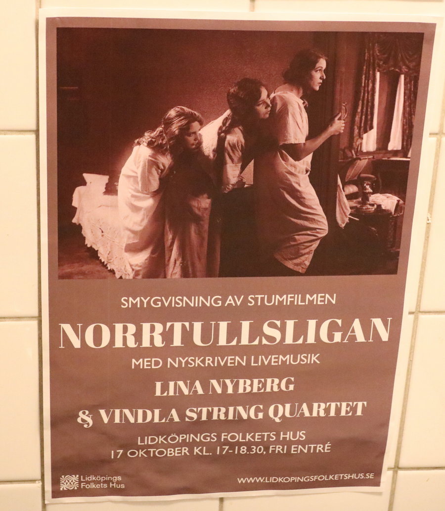 Folkan har med stöd av Statens kulturråd kunnat engagera kompositören (och jazzsångerskan) Lina Nyberg att skriva ny musik till stumfilmsklassikern Norrtullsligan. Och det blev inget vanligt stumfilmspianoklink. För Lina Nyberg har samarbetat med stråkkvartetten Vindla String Quartet. Tillsammans framförde de nynoterad musik i kombination med vissa improviserade avsnitt. Och det skedde live med Norrtullsligan rullande på duken.