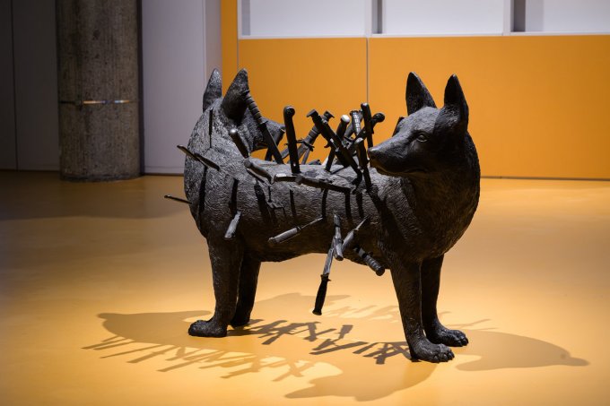 Sydafrikanske konstnären Robin Rhode visar en skulptur av en tvehövdad hund, en symbol för motståndet mot apartheid med ryggen full av knivar efter övergrepp.