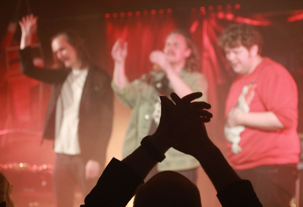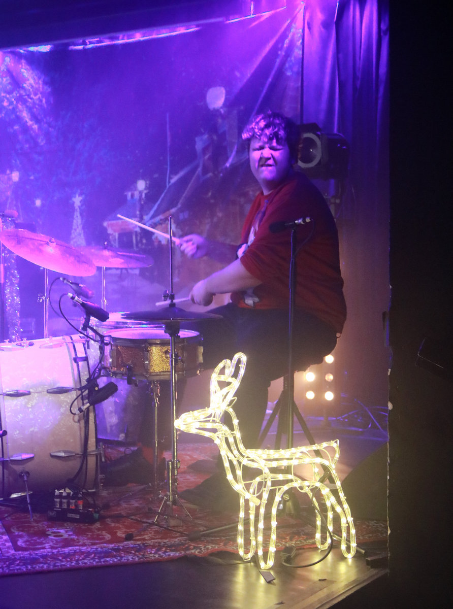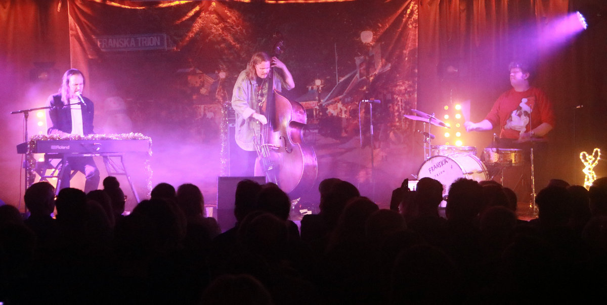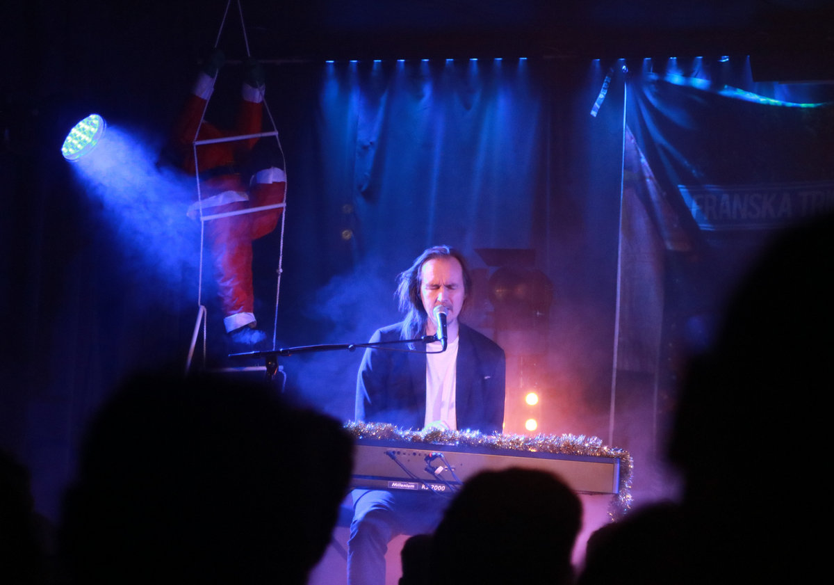 Scenen var dekorerad med glitter, en tomte svävande i en trapets, en självlysande ren och annat juligt. I fonden en dekormålning av enskymningsstadsbild med en Franska Trion skylt. Det var laddat för ett nedslag i turnén Jul med Franska Trion.