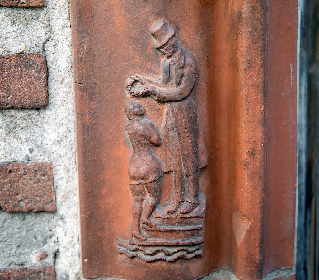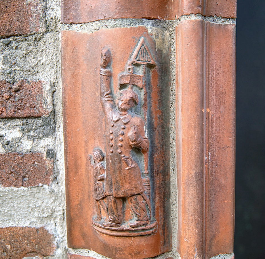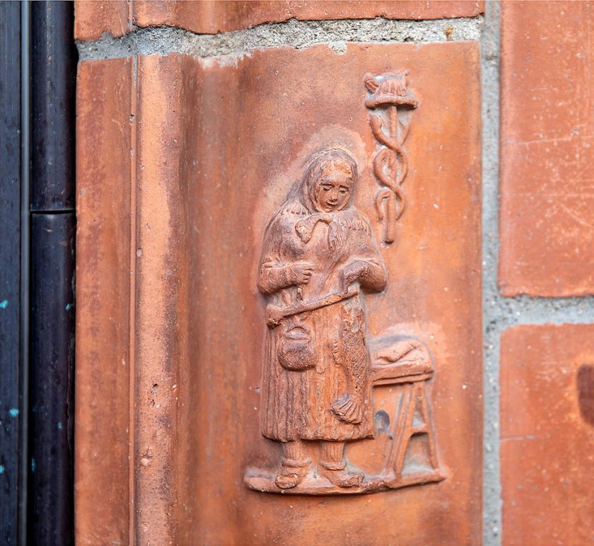 Figurerna utfördes på huset som stod klart 1931 och föreställer olika stockholmstyper som syntes i stadsvimlet vid den tiden.