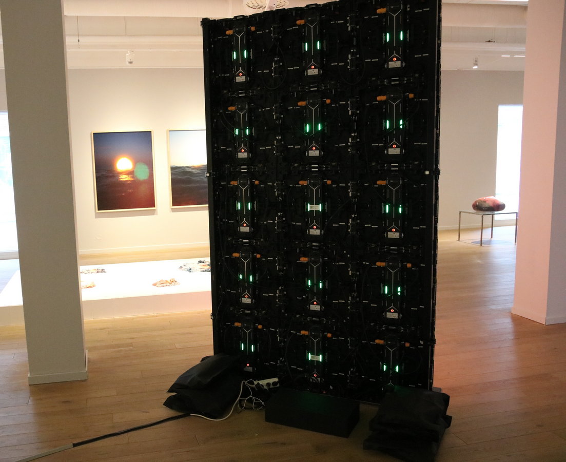 Mitt första intryck när jag kom in i utställningssalen var att det här ett reklamevent. En möts av en stor skärm av sladdar och blinkande lampor. På andra sidan syns en bildskärm som visar ett stort solliknande eldklot omgivet av en gloria som speglas i ett lätt vågigt rött vatten. Det är oerhört effektfullt, som en reklam på Times Square. Som ett bra broderi är det lika bra på både fram och baksida. En slående metafor för att vår bild av naturen hur man än vrider och vänder på bild och begrepp är en konstruktion.