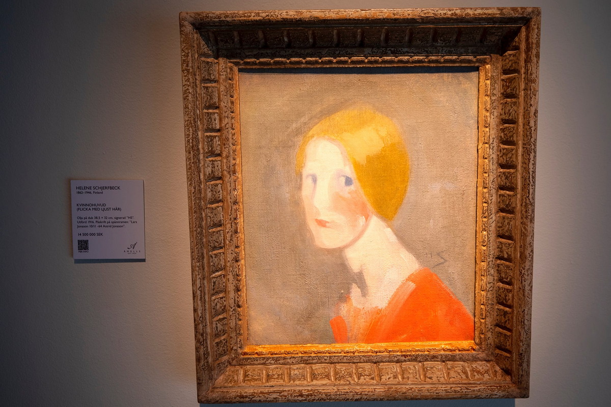 Fina tavlor på utställningen, men dyra. Dyrast var en liten oljemålning ”Flicka med ljust hår” av Helene Schjerfbeck (1862–1946). Den kostar 14,5 miljoner kronor. Den hade ingen röd lapp, men de hade flera av de andra verken.