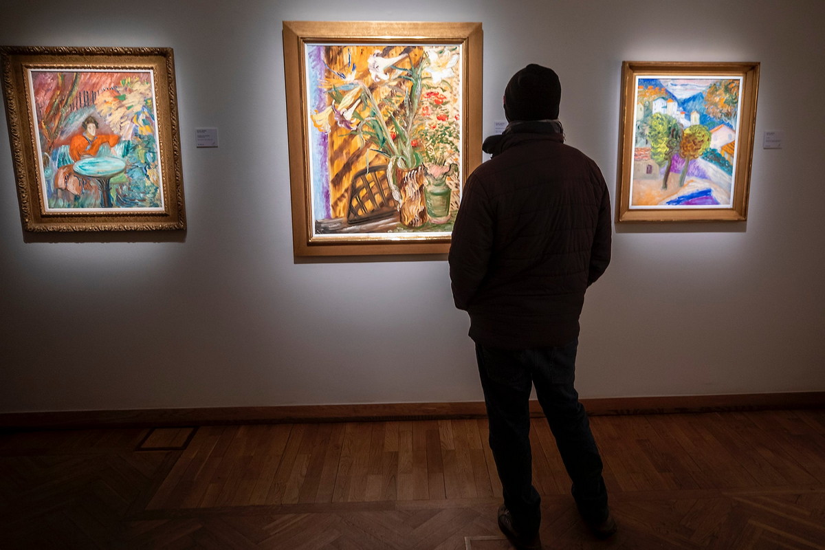 Schjerfbecks flicka (t.v.) — Man betraktar tre målningar av Sigrid Hjertén och Anna Palms akvarell av ”Norrbro och ”nya” Operan (t.h.)