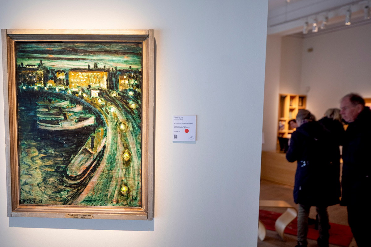 Agnes Cleves (1876–1951) ”Aftonsken över Nybroviken” från 1931 har en expressiv lyster. Hon målade utsikten från sin ateljé i bostaden sex trappor upp i huset på Strandvägen 3, nära Nybroplan.