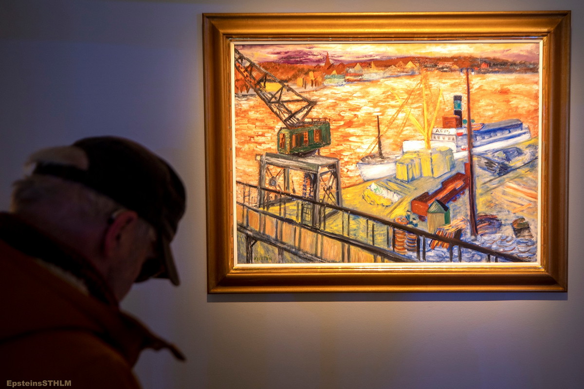 Själv spanade jag särskilt in Stockholmsmotiven och fastnade för Sigrid Hjerténs (1885–1948) ”Mot aftonen, Stadsgården” från 1934, en plats i dag aktuell för det kommande bygget av Nobelprismuseet. I förgrunden, längst till vänster, ses en gångbro över Stadsgårdens många tågspår som fanns på den tiden, en godsvagn, en lyftkran och vid kajen ligger ångaren Aros som gick i reguljär trafik mellan Stockholm och Västerås åren 1872–1947. Normalt låg den på Mälarsidan. Man ser också två hamnarbetare som hanterar gods. Det var långt före containrarnas tid.