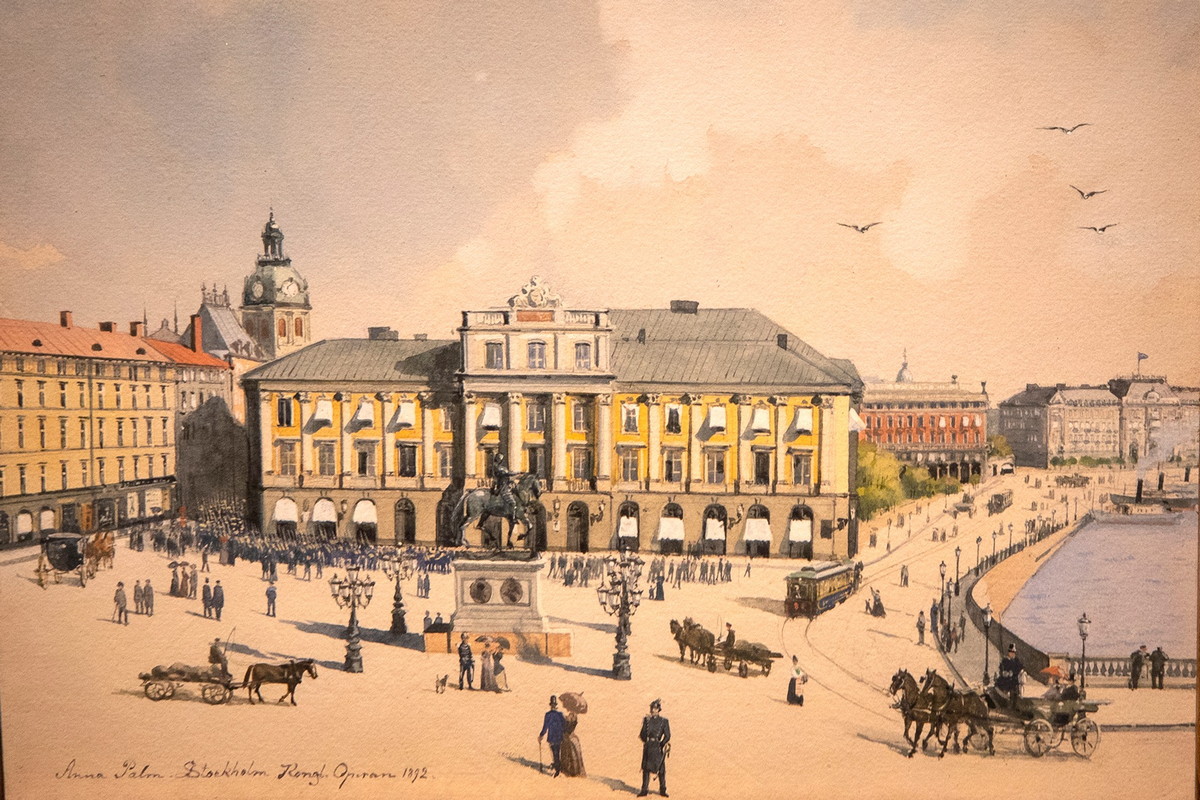 Anna Palm (1859–1924) är känd för sina många akvareller med Stockholmsmotiv, ofta med ett rikt folkliv, många målade (efter olika förlagor) i Italien där hon bosatte sig 1896. I den fotografiliknande akvarellen av Gustav III:s opera 1892 (samma år som den revs för den nya operan på samma plats) ses hästekipage, hästspårvagnar, en polis med sin bajonett, en dalkulla och hela vaktparaden som svängande marscherar in på Gustav Adolfs torg från Arsenalsgatan.