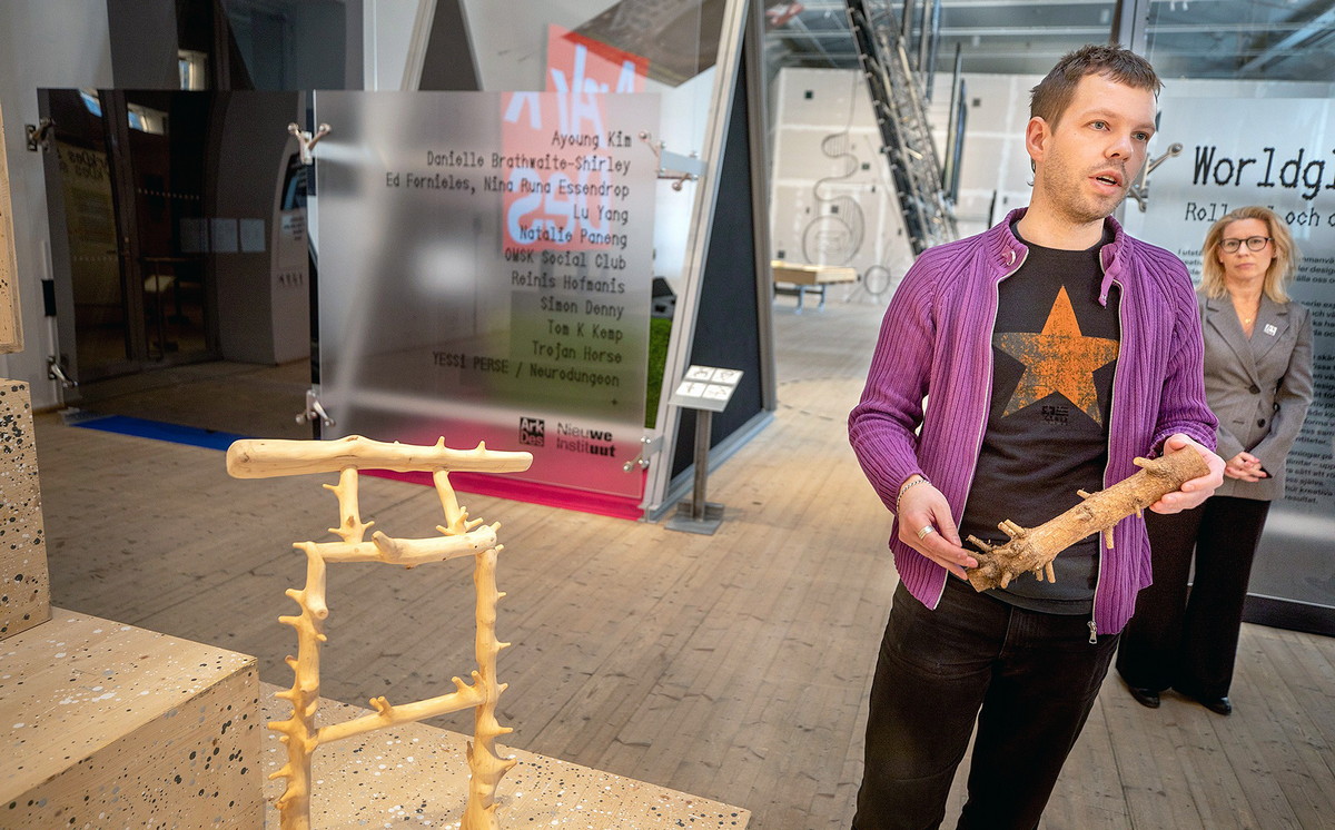 Här finns också Rickard Torstenfelts charmiga herrbetjänt med mängder av krokar ”så man kan hänga hela garderoben där” tillverkad av en före detta julgran. Han säger sig ha undersökt hur formen på ett objekt påverkas av när man använder ett material som inte helt går att styra.