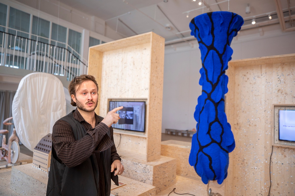 I sitt masterarbete i design på Konstfack har han konstruerat jättestora ”snigelliknande” sjok av ull (restprodukt från köttindustrin som i stor omfattning slängs till ingen nytta idag).