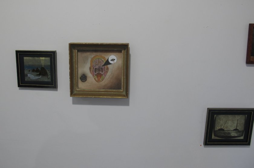 Det är målningar som ser gammeldags ut. De är målade i ett föreställande manér i en återhållen färgskala. Motiven är märkliga. I en av dem ser en vad som ser ut som en skalle med huden avdragen. En spetsig strut går in i den och i dess yttre ände finns en ögonliknande öppning med ett snöre hängande ut som om man skulle kunna dra ut nåt därinnifrån. Perspektiven både bildligt och bokstavligt är annorlunda och så vill väl Örtemark att den här konsten ska vara. Man känner igen föremål men de tycks vilja visa en annan sida och ges andra sammanhang.