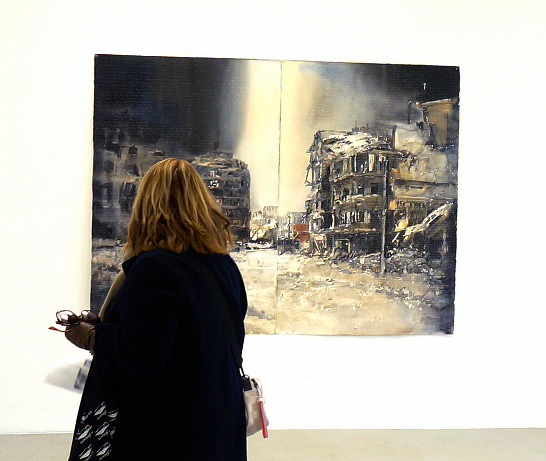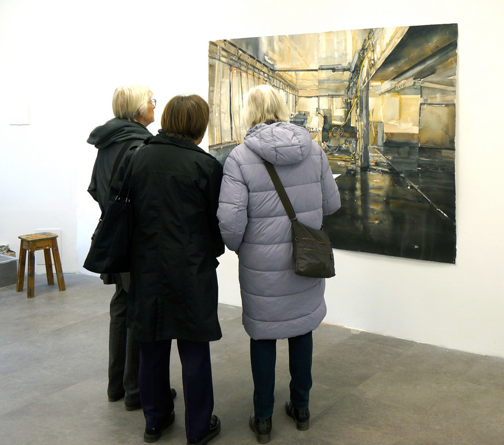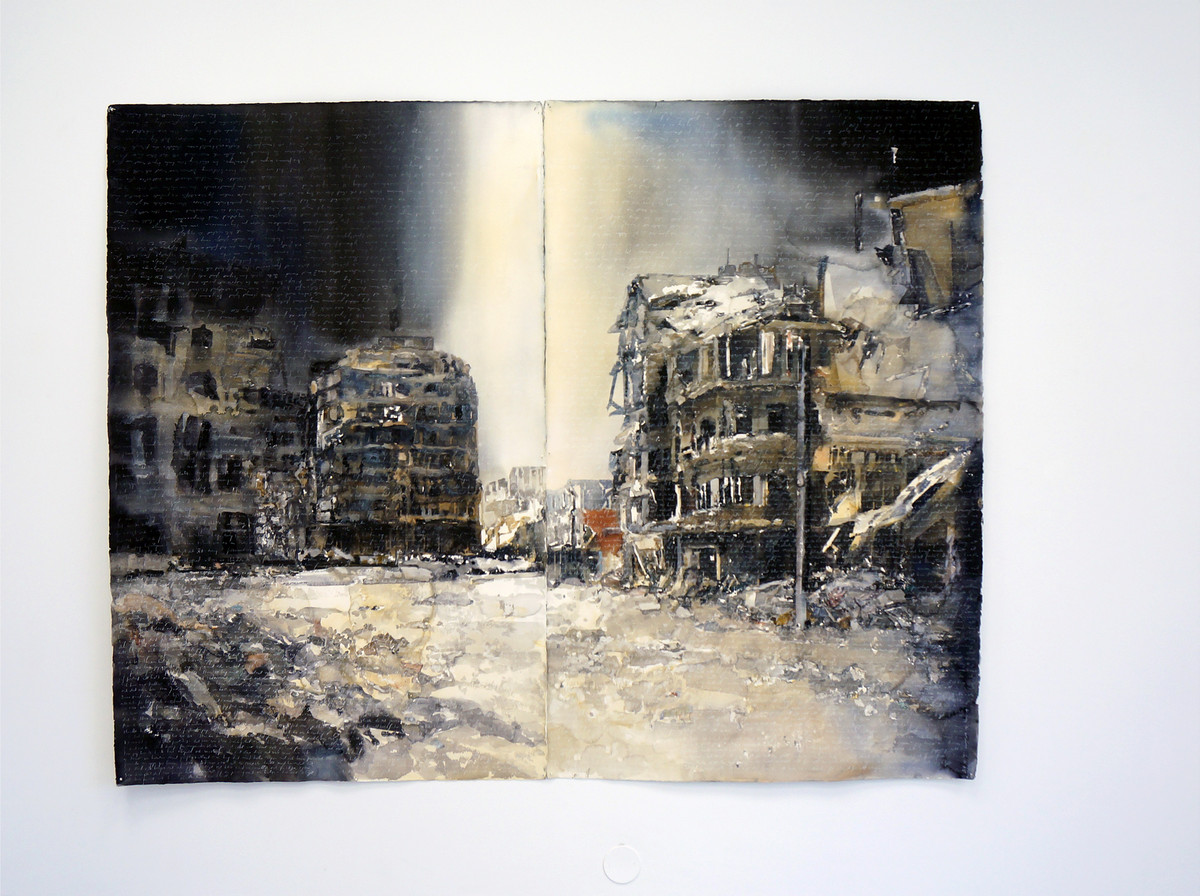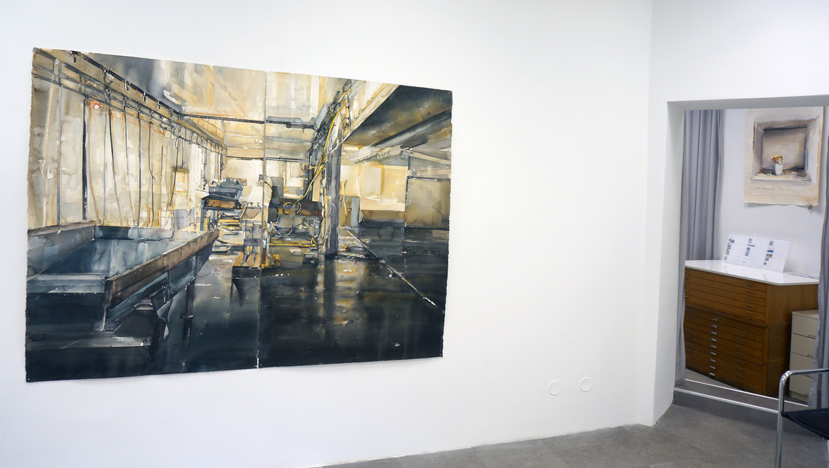 På Lars Lerins utställning hos Hammarén finns en stor akvarell med raserade hus som får mig att tänka på Roj Fribergs stora bilder i grafit på övergivna hus som bara står och väntar på att bli rivna.