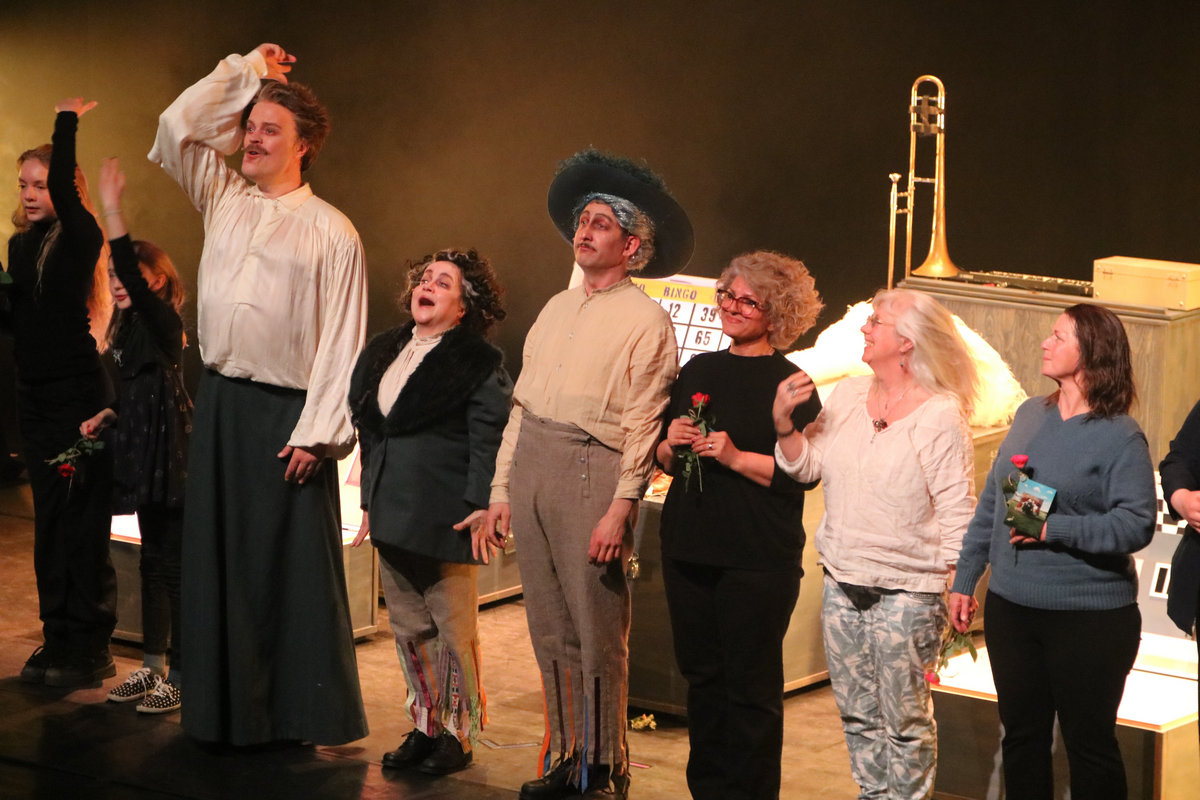 Skådespelarna glänste i sina disparata och mångskiftande roller. De gestaltade de mest märkliga typer. Både Siri Hamari och Per Öhagen skapade roliga typer. Här handlade det inte om psykologisk gestaltning utan att yxa till levande typer. Och det kunde de verkligen. Båda var så kul att följa. Siri Hamari var galet rolig i varje karaktärs egenheter och galenskaper. Till varje gest lade hon en delikatess. Viktor Brobacke stod också för de musikaliska inslagen och både sjöng, spelade trombon och annat.