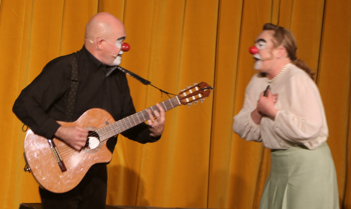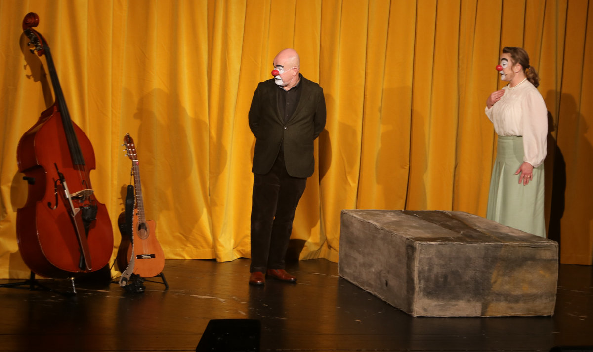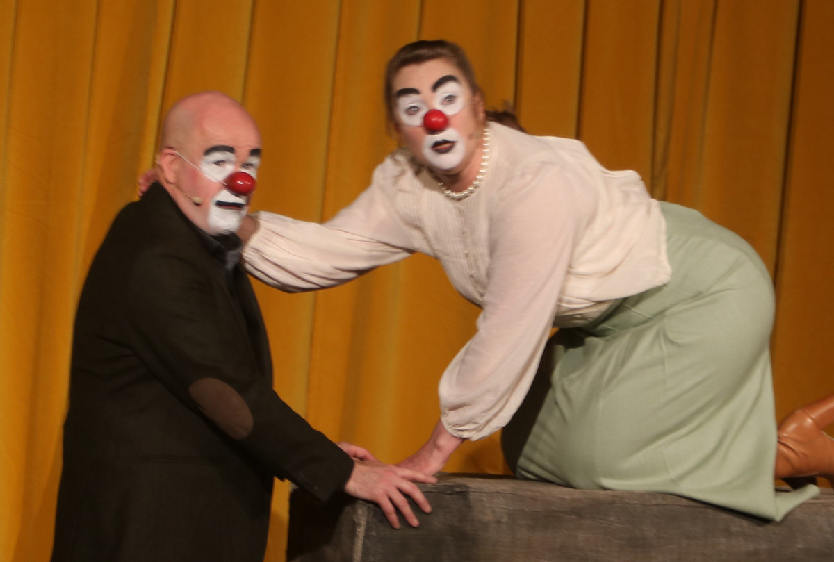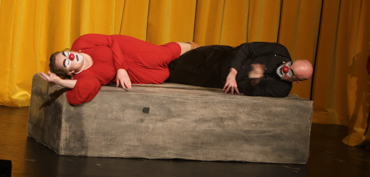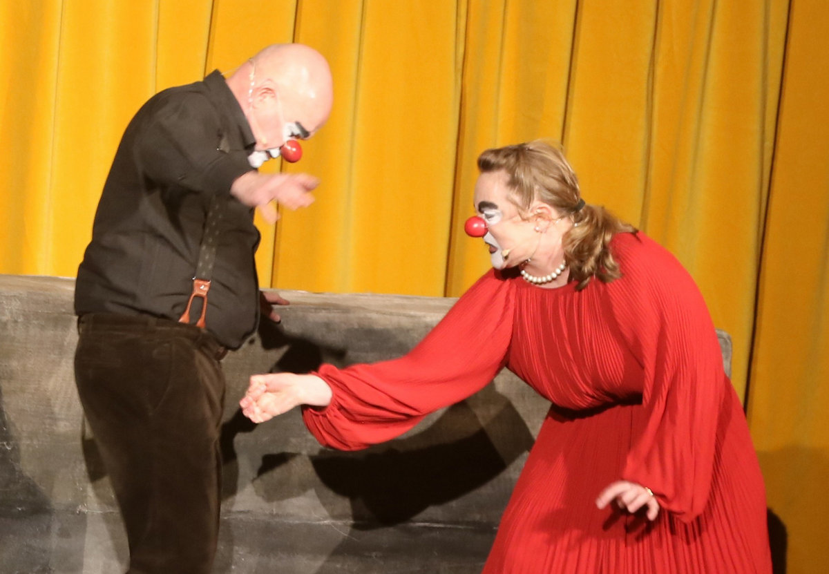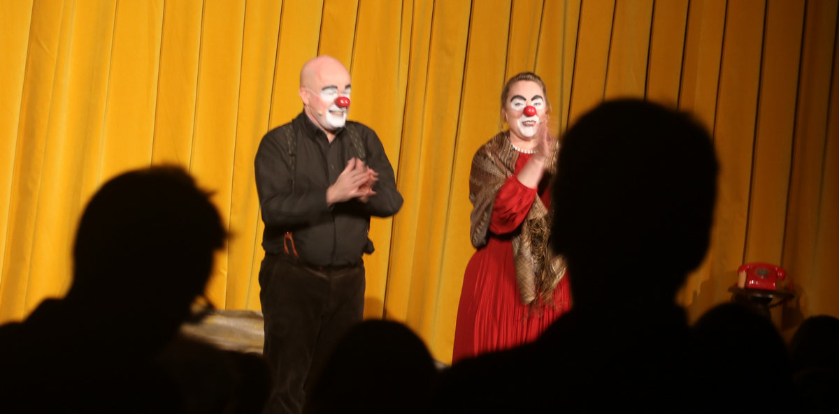 Oavsett vilket stycke de spelar känner vi igen dem direkt. De har alltid vitsminkade ansikten och röda clownnäsor. Och speciella röster och diktion. Deras specialitet är att på ett respektlöst sätt fullt av insiktsfull respekt ge sina tolkningar av klassiker av de största som Shakespeare, Tjechov, Strindberg. Nu hade turen kommit till Ingmar Bergmans Scener ur ett äktenskap. Och de gav den dysterkvistens berättelse en välbehövlig boost. Bergmans filmer är ofta pretentiösa men i Schtunkarnas bearbetning tas de ner på jorden och fås därigenom att lägga betydelser tydligare i dagen.
