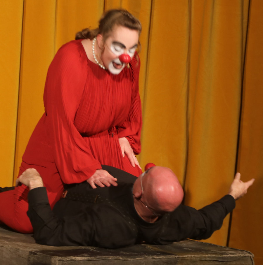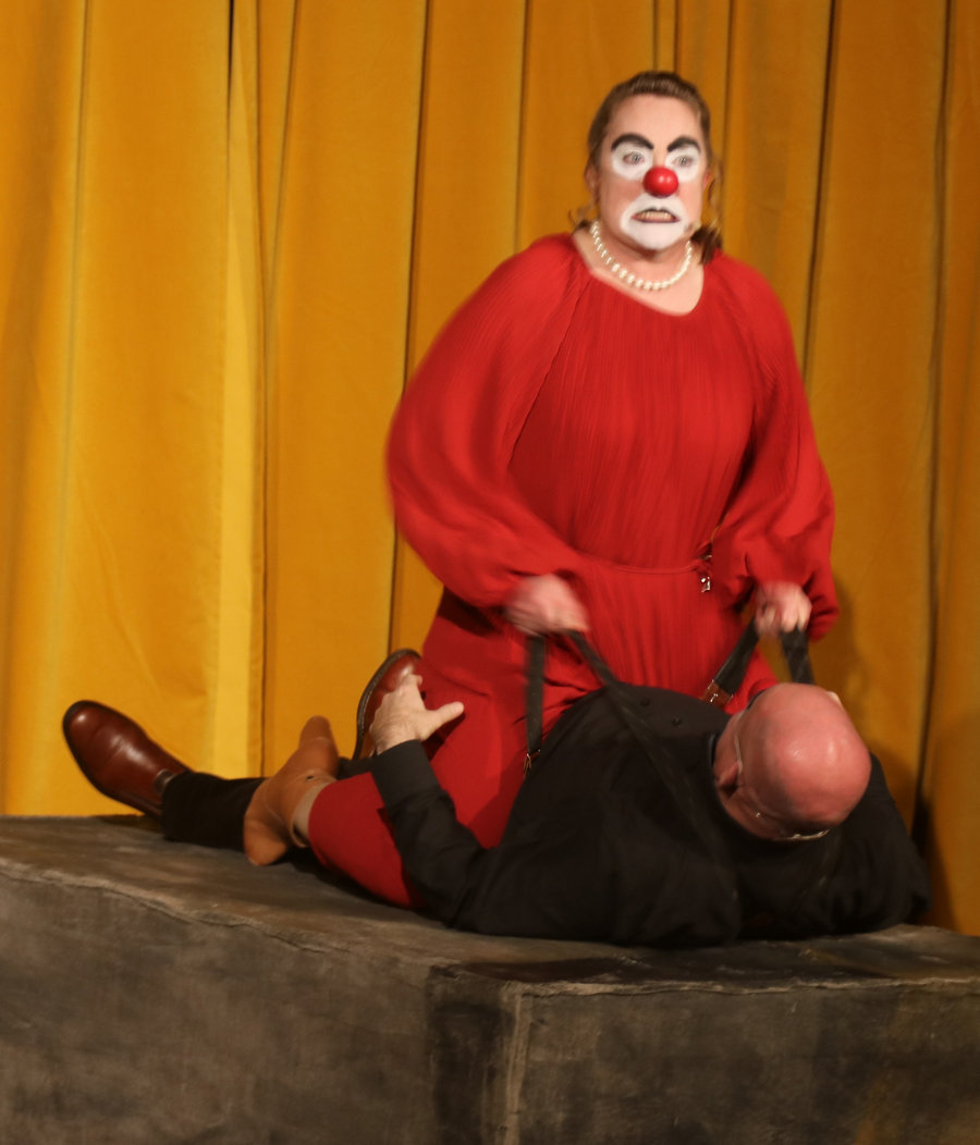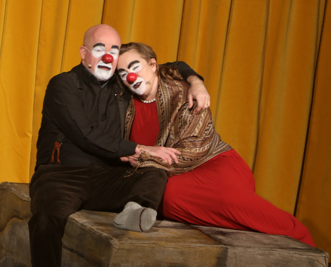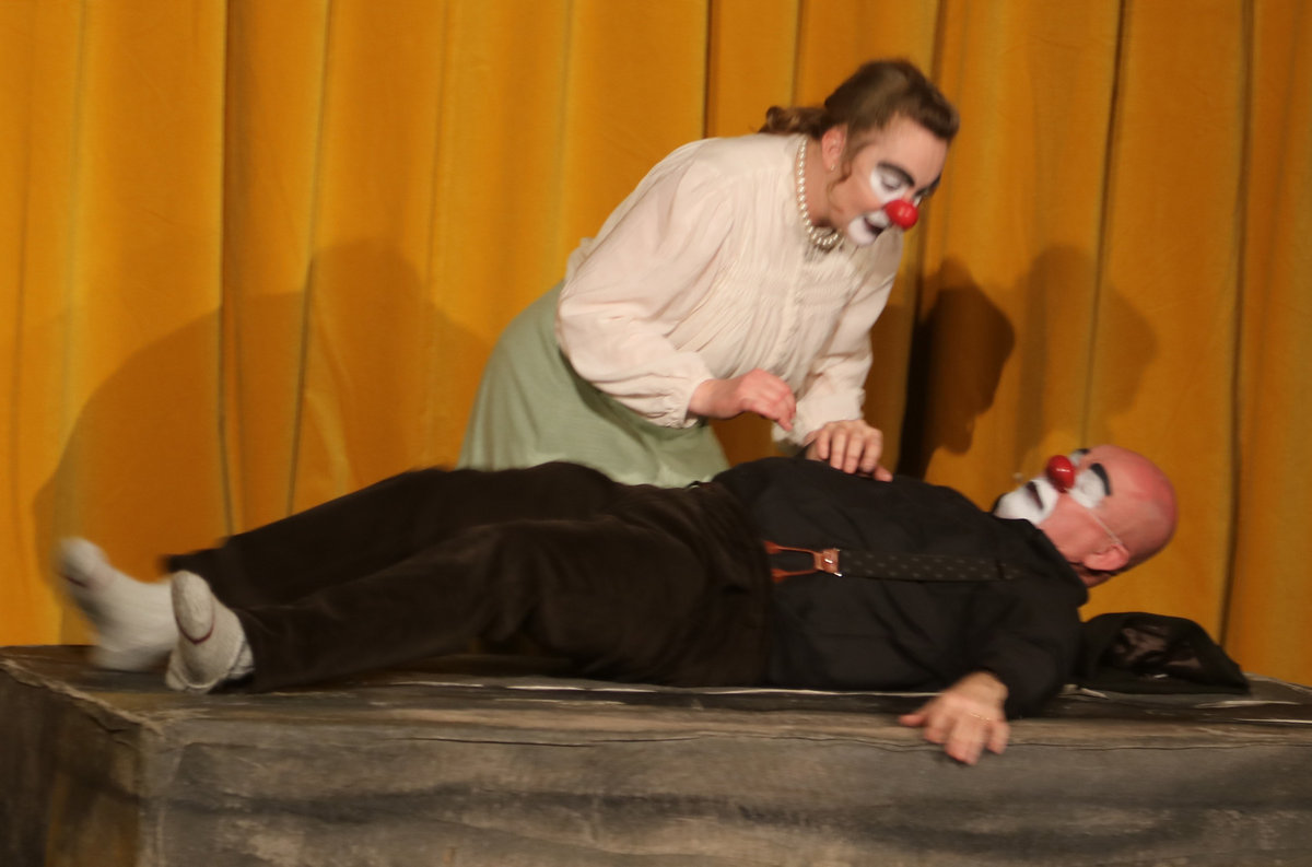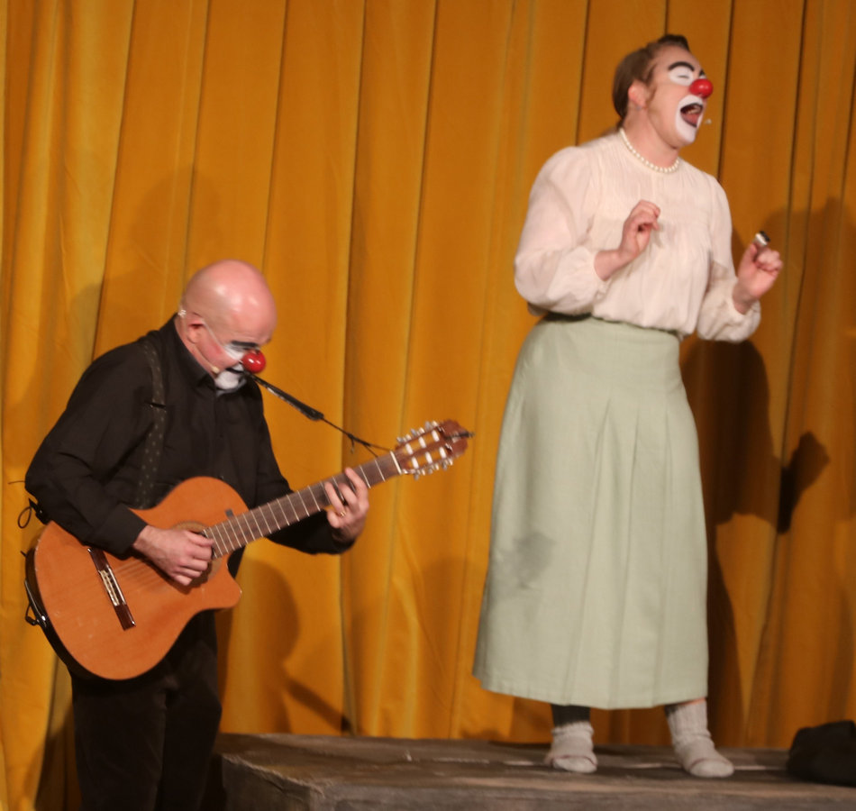 Oavsett vilket stycke de spelar känner vi igen dem direkt. De har alltid vitsminkade ansikten och röda clownnäsor. Och speciella röster och diktion. Deras specialitet är att på ett respektlöst sätt fullt av insiktsfull respekt ge sina tolkningar av klassiker av de största som Shakespeare, Tjechov, Strindberg. Nu hade turen kommit till Ingmar Bergmans Scener ur ett äktenskap. Och de gav den dysterkvistens berättelse en välbehövlig boost. Bergmans filmer är ofta pretentiösa men i Schtunkarnas bearbetning tas de ner på jorden och fås därigenom att lägga betydelser tydligare i dagen.