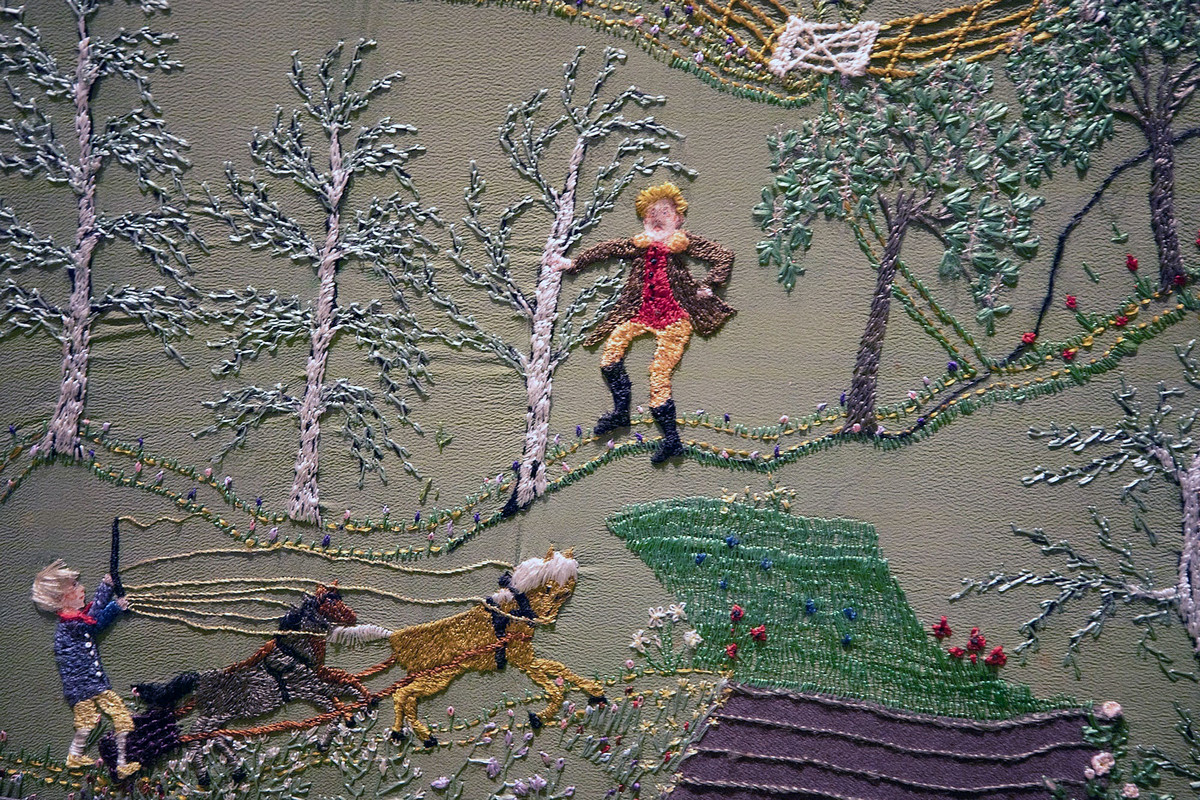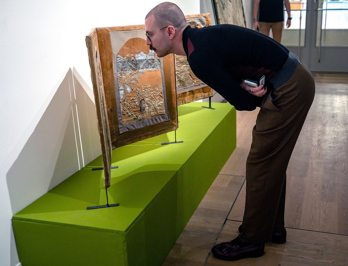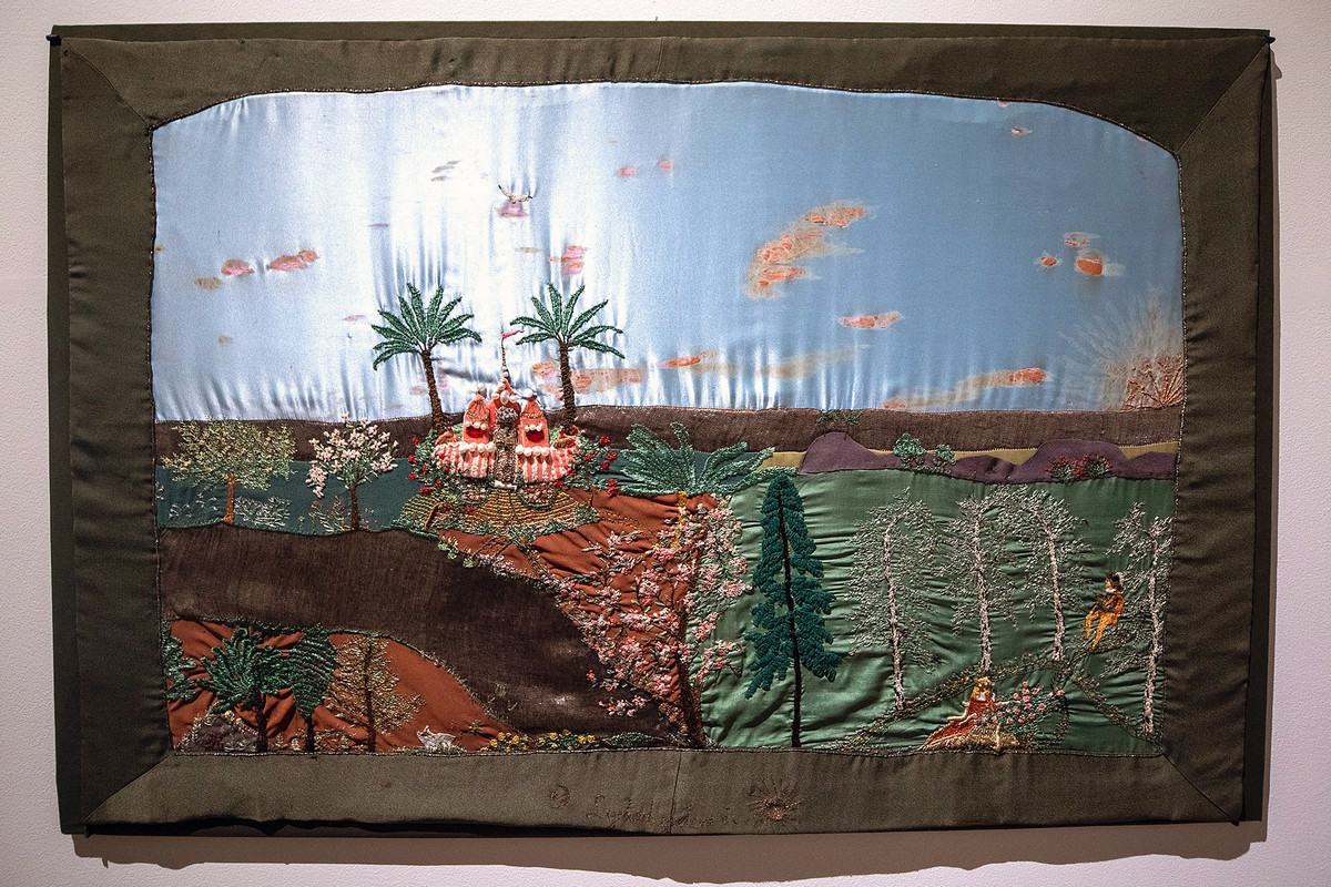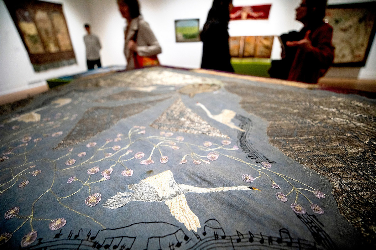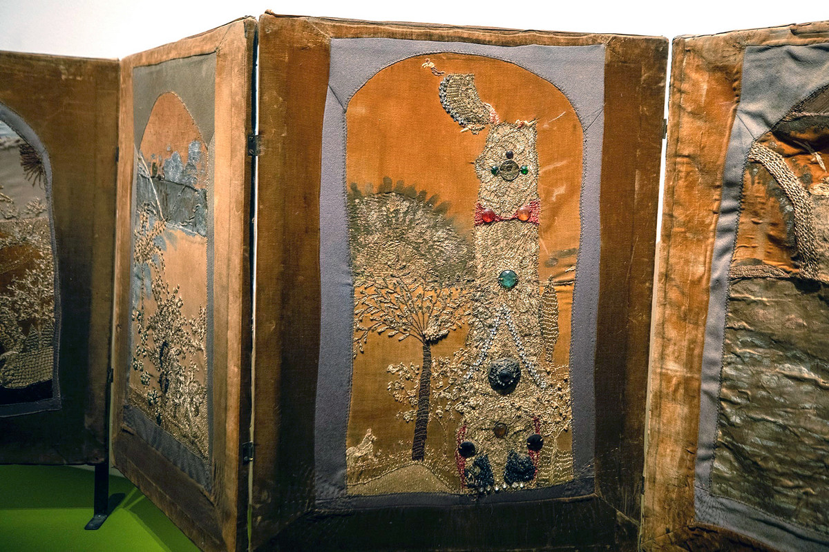 Konstverken består av broderade draperier, vikskärmar, flygeltäcken, kuddar, dukar, väskor och andra skapelser.