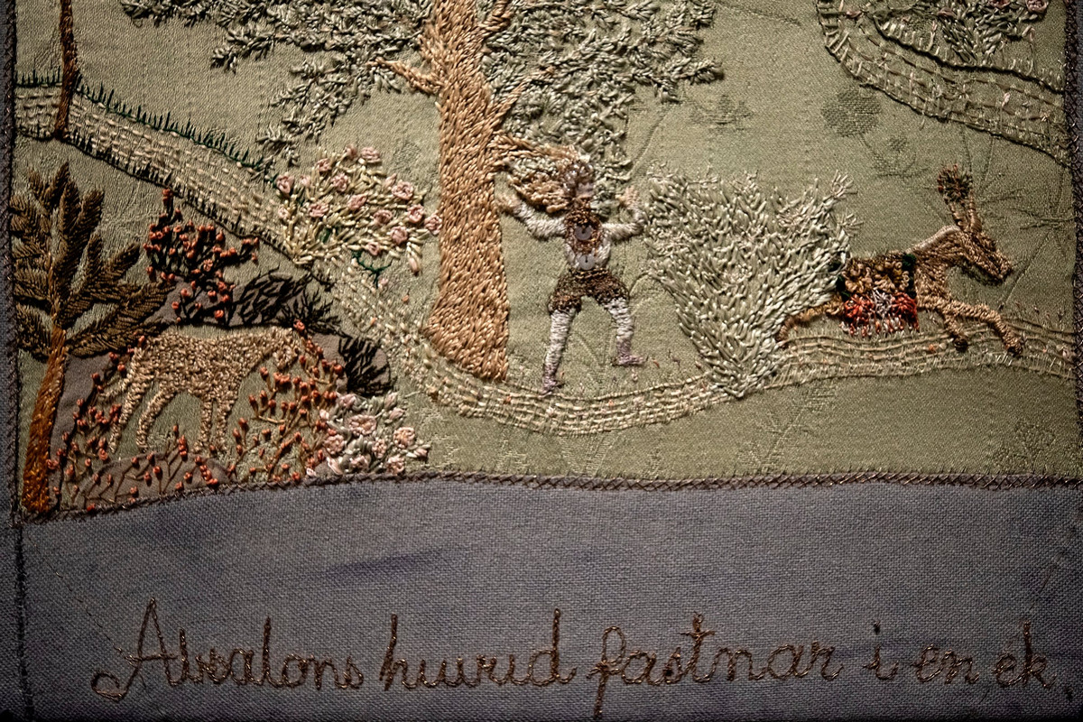 Tjugonio av Anna Casparssons magnifika broderier, de äldsta runt hundra år gamla, ställs ut i museets mindre utställningsrum ”144 kvadratmeter” alldeles intill restaurangen under perioden 25 april till den 27 september i år.